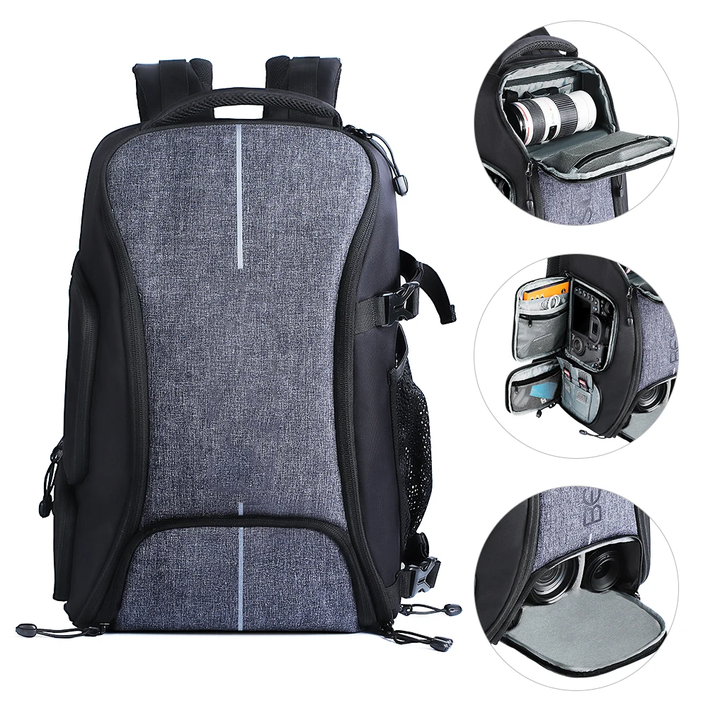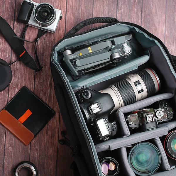Features | Mirrorless Camera BagThree compartments 17.3 x 11.8 x 9.4 inch, approx. 24 liters. The upper compartment is suitable for a 200mm lens or a Mavic Air 2 drone. Medium compartment for one camera, 2 standard lenses or 2 cameras. Lower compartment for 3 standard lenses or 1 camera, 1 lens. Camera insert for backpack. Quick access Side access for quick access to the SONY NIKON CANON camera and accessories while wearing - so that you are quickly at hand in the crucial moments. Supports fully open from the front, helps you organize all compartments and equipments clearly. Also can be dji drone backpack(for travel). Additional storage dslr camera bag Many functional pockets for storing cell phones, filters, data cables, chargers, wallets, memory cards, keys, glasses, IPAD, etc. (More than mosiso camera backpack) 15.6 inch laptop compartment The padded upper compartment offers space, especially for laptops, MacBooks and tablets up to 15.6 inches. |
