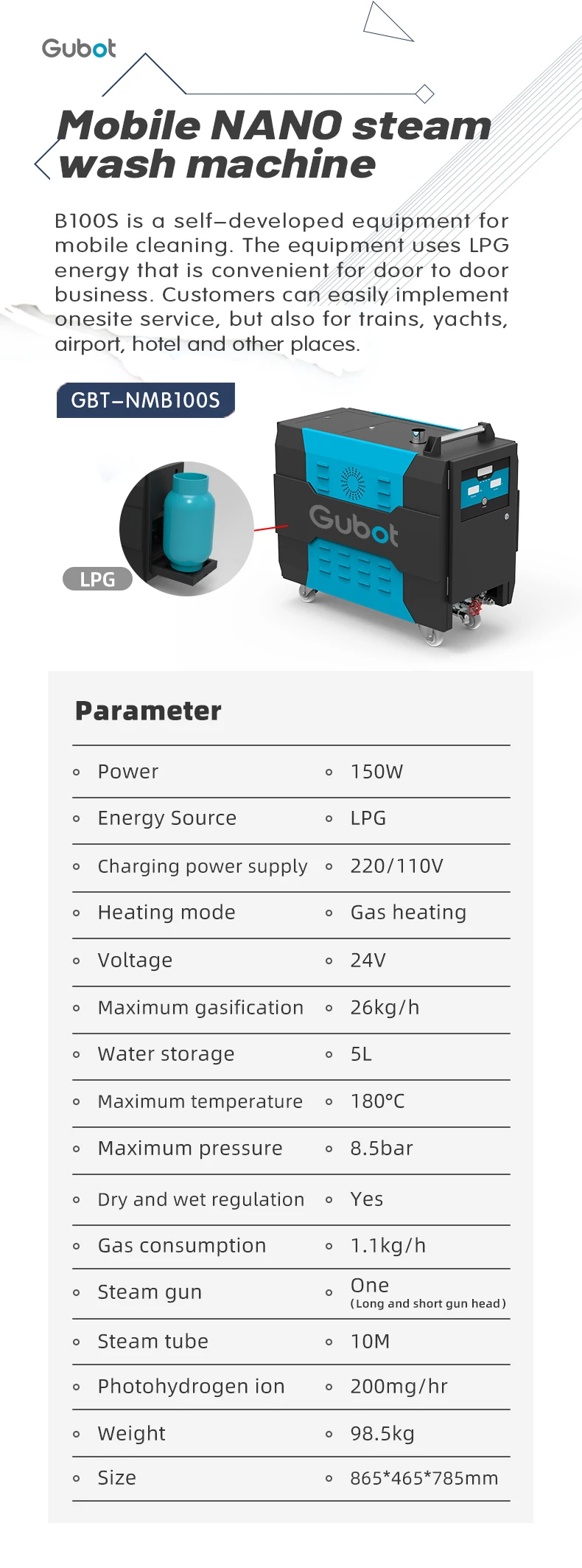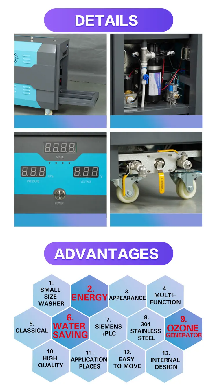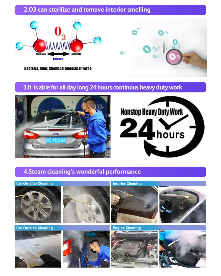 1. Small size washer:only 0.3cbm and 95kg, ideal model for offering mobile service. 2. Use only 1kg LPG per hour, energy and cost effective. 3. Combined with blue and black colors, amazing apperance. 4. Multi-function washer, can clean car ourside, inside and engine. 5. Brilliant cleaning effect and no damage to car paint. 6. Water saving:use only 1 liter water to wash one car. 7. The original circuit is imported from Siemens, together with PLC control center, stronger anti -interference performance. Ensure the stability and long-term operation. 8. Internal pipe connection parts are 304 stainless steel to ensure product quality and longevity 9. Ozone generator can remove virus, mite and odor from the car. 10. High-quality insulated pipes have better insulation effect and longer service life. 11. Can be used in many places for cleaning, such as home, office, hotel and hospital. 12. No need to connect electricity and water pipe, easy to move. 13. Fully enclosed special heating pipe design is adopted inside, with SS five-layer double row pipes to ensure more accurate, higher heating speed and efficiency, so that t he equipment can maintain stable pressure continuously.