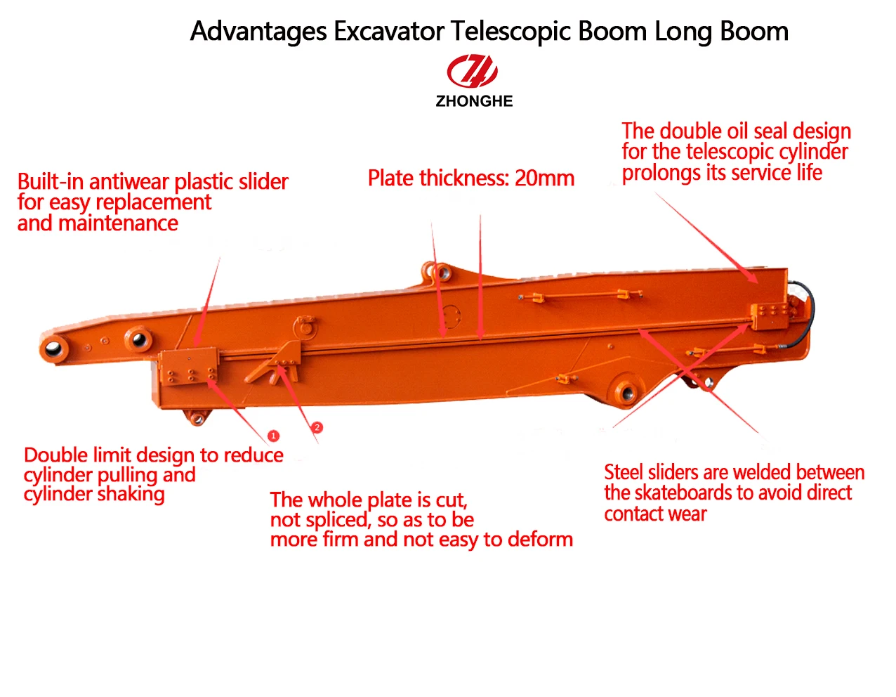 Kaiping Zhonghe Machinery Co.,Ltd. established in 2018, it is a combination of manufacturing and trading, specializing in customizing different kinds of excavator boom arms and attachments.