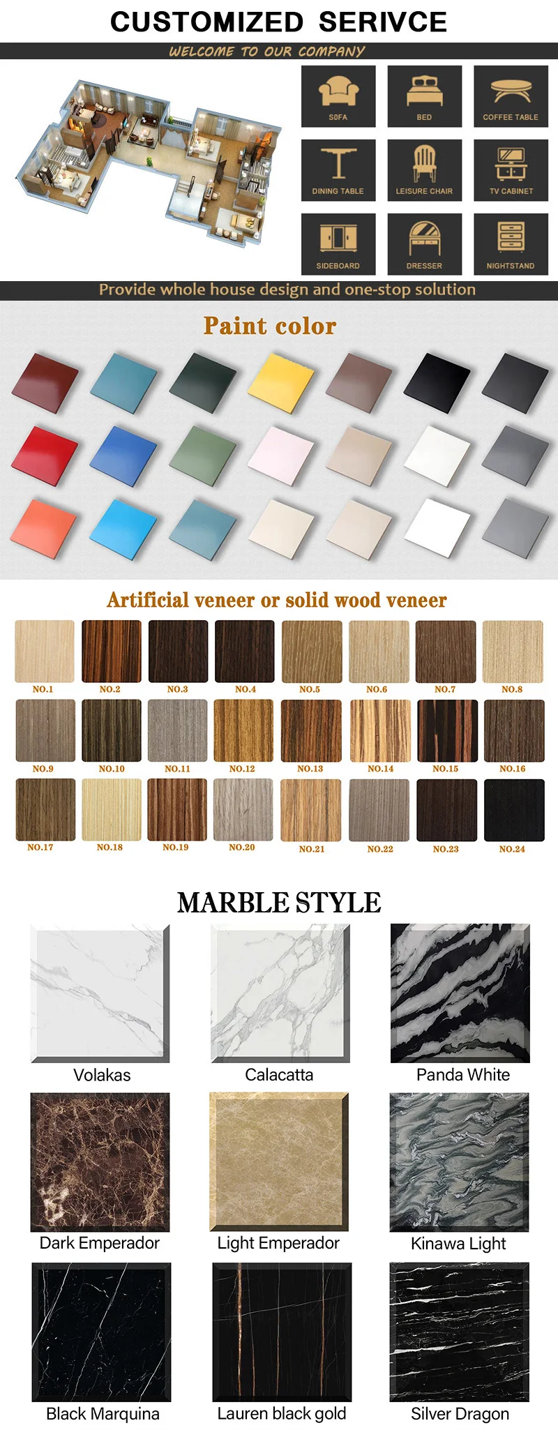 B. Dining set, TV cabinet,coffee table:marble,stainless steel,solid wood,MDF.It is according to different items, you could ask our sales for details.