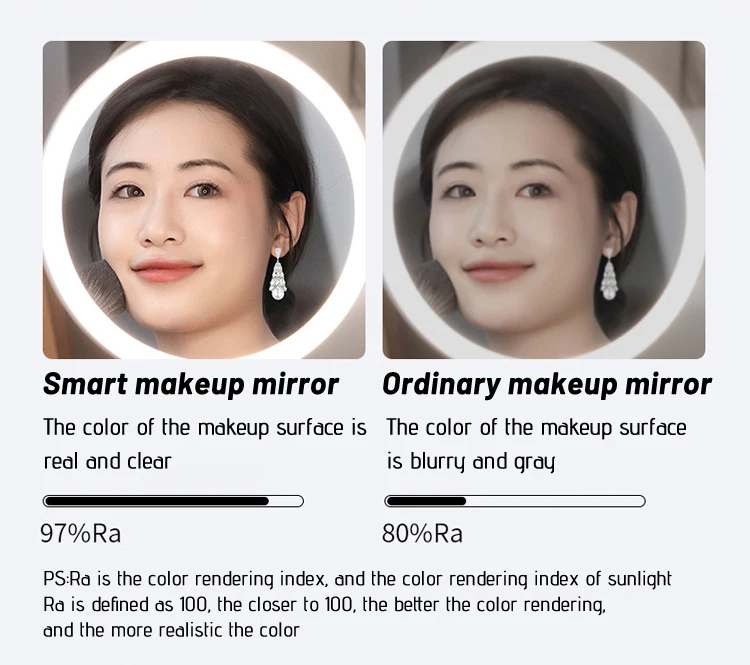 Functional features | Built-in battery;With bluetooth speaker function; 8 colors ambient lighting effects to choose at will; Mirror surround light with three colors adjustable; Adjustable brightness;Rear TF card insertion; Audio cable playback;Rechargeable treasure function; Hand-swipe switch with 8x magnifying glass; Air shock absorbing footbed; With 15W wireless fast charger. | ||||