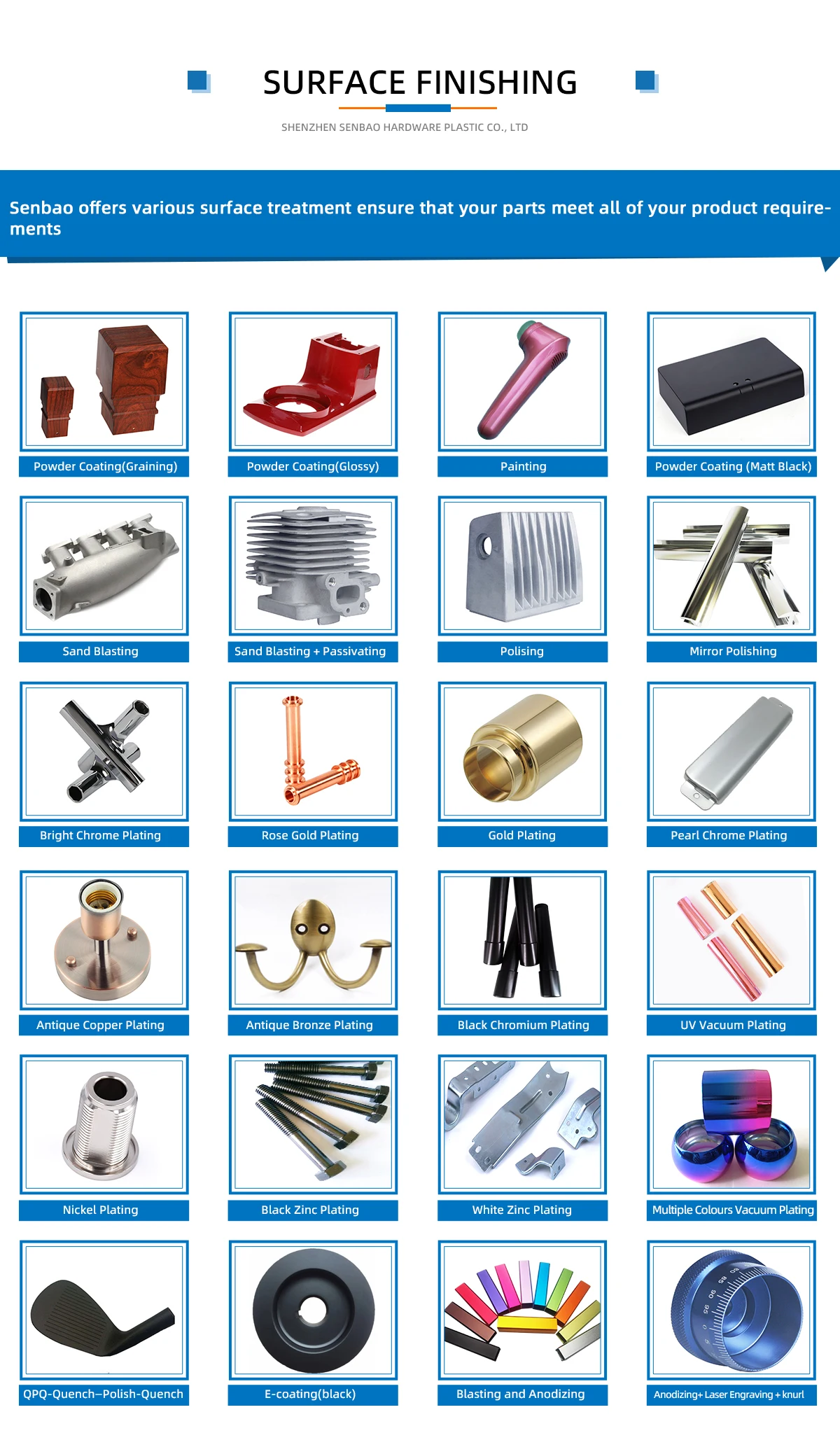 Surface treatment | Anodizing, Sandblasting, Metal Plating, Polishing, Painting, Powder coating, Brushing ,Silk-screen , Laser Engraving etc. | ||||||