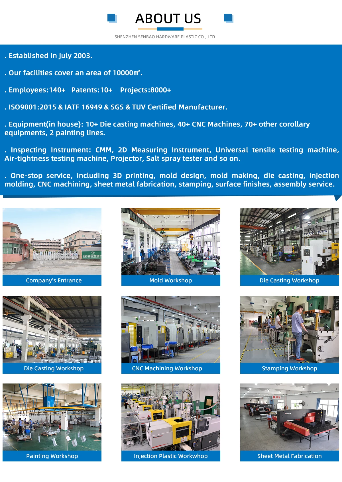 Service | CNC Milling, CNC Turning, Wire EDM Cutting, 3D Printing, Vacuum Casting, Reaction Injection Molding, Plastic CNC Machining, Laser, Mold Making, Aluminum Alloy Die Casting, Zinc Alloy Die Casting, Injection Molding, Plastic Parts, Cutting, Stamping Parts, Bending Parts, Sheet metal fabrication, Aluminum Extrusion, Heat sink..... | ||||||