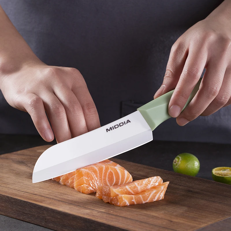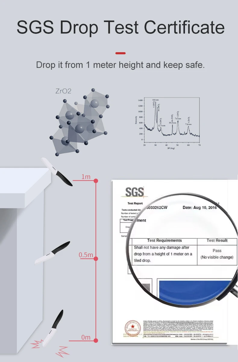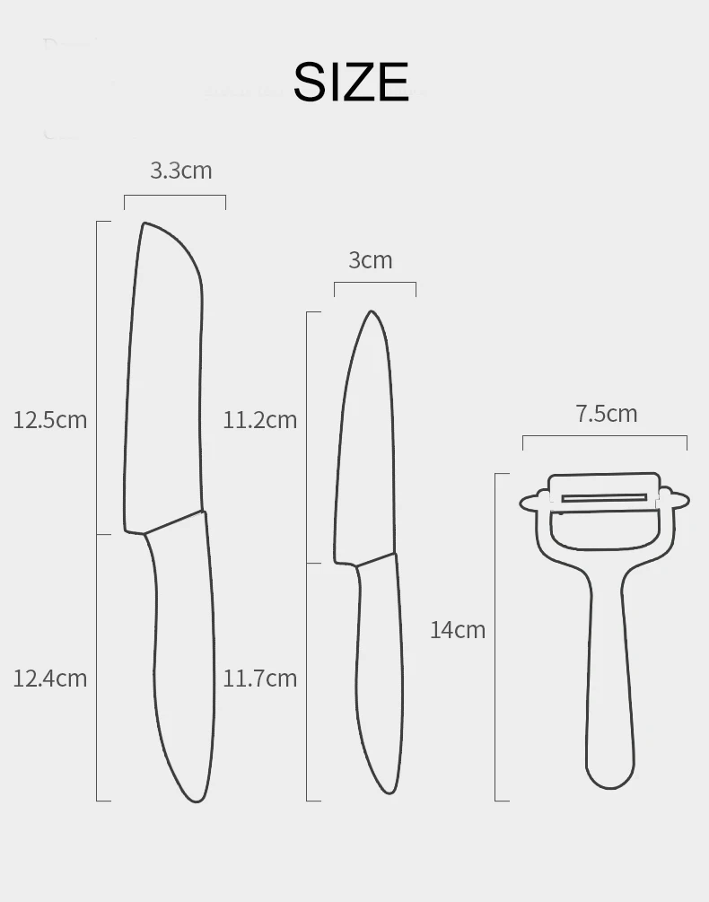 Feature | 1. Extra sharp, long-lasting sharpness, no need resharpening. 2. Excellent toughness, pass SGS 1m drop test, not easy to break. 3. Hygienic and healthy, protect babies' delicate digestive system. 4. Rust-free, no metallic taste when cutting food. 5. Cutting apples and other fruits without oxidation. 6. Doesn't transfer flavors. 7. Doesn't contain heavy metals. 8. Cutting tomatoes, peaches, and other juicy fruits and vegetables without juice flow, locking in nutrients. 9. Doesn't trap dirt or stains, easy to clean. 10. Acid-resistant, alkali-resistant, corrosion-resistant, doesn't react with any ingredients. 11. Lightweight, weighing only half of metal knives, doesn't tire hands after long-term use. 12. Compared to cold steel knives, ceramic knives have a shell-like luster, are elegant and luxurious, more fashionable and aesthetically pleasing, showcasing a refined lifestyle. 13. Not easy to stain. |