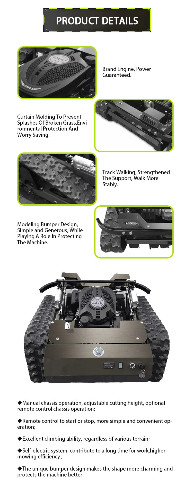In the fields of agricultural unmanned machinery products, the company is mainly committed to the production, development and sales of agricultural unmanned aircraft, remote control lawnmower, remote control spray machine, unmanned rotary cultivator, unmanned orchard management machine and other products.