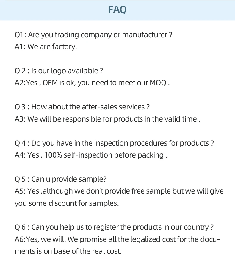Q 5 : Can u provide sample? A5: Yes ,although we don't provide free sample but we will give you some discount for samples. Q 6 : Can you help us to register the products in our country ? A6:Yes, we will. We promise all the legalized cost for the documents is on base of the real cost.