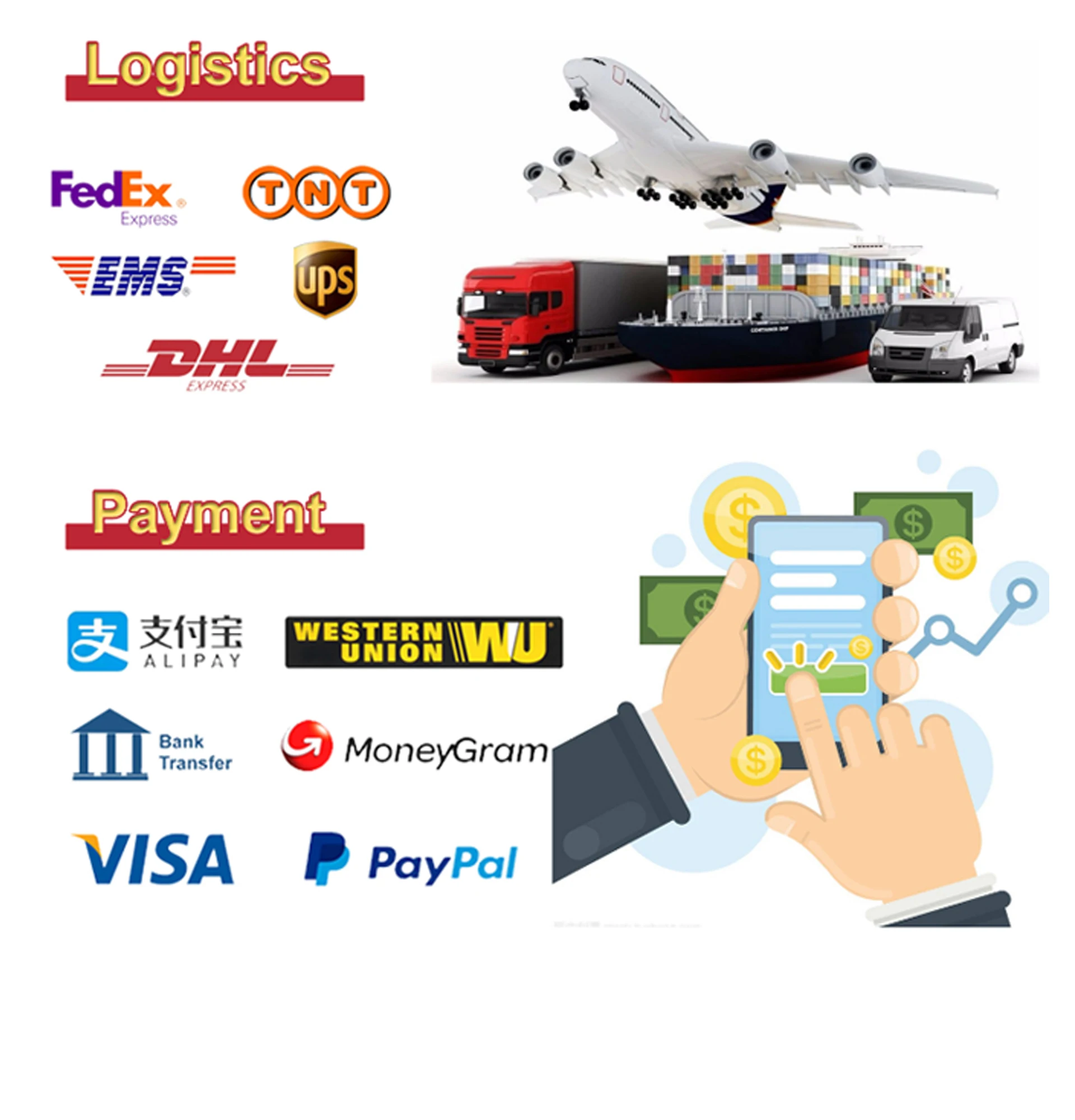 Shipping | By Express like DHL, Fedex, UPS, TNT, Aramex,EMS, etc for small orderBy Sea or Air for large order. |