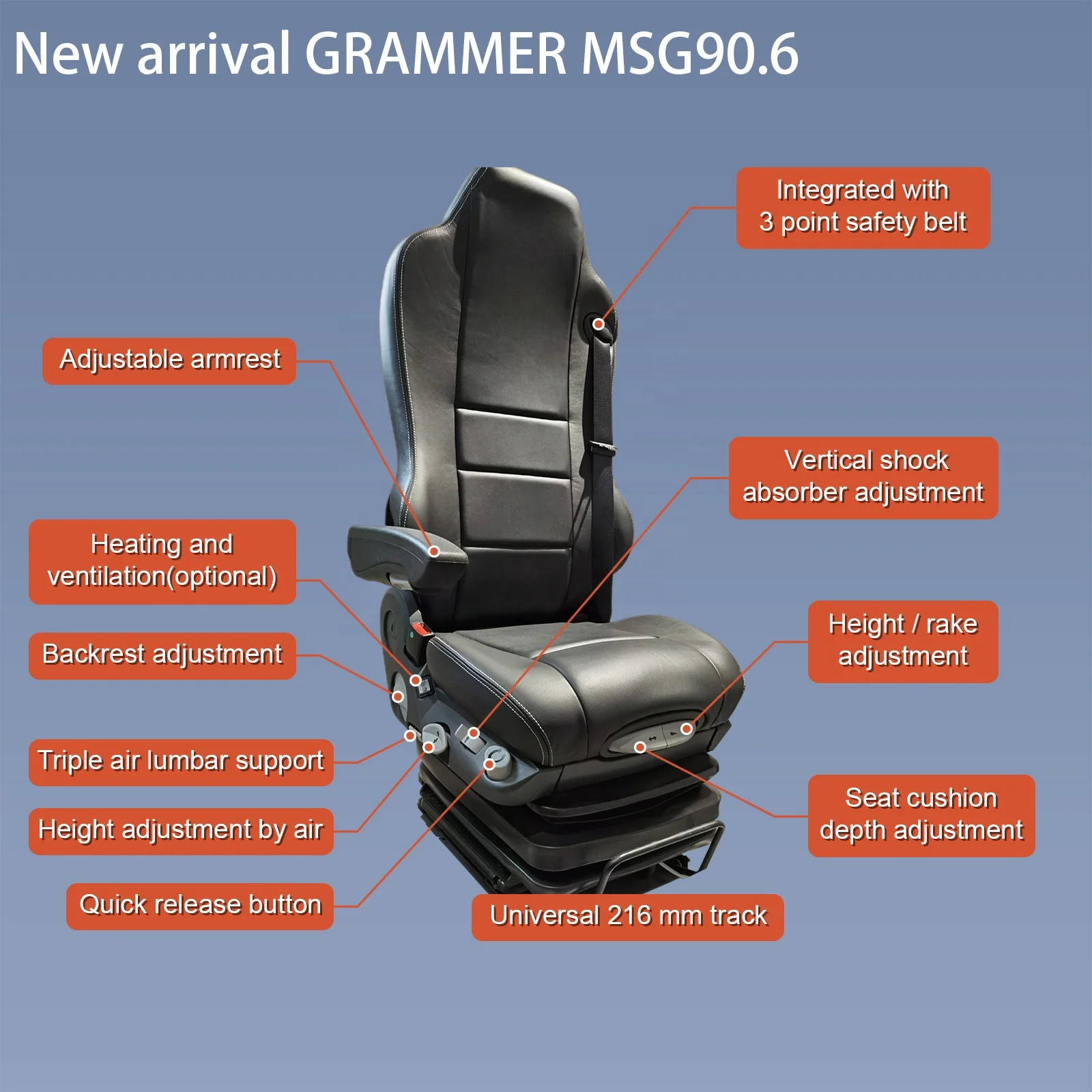 Technical Specification | 1.Air height adjustment 2.Front and back adjustment 3.Quick release 4.Shock absorber adjustment 5.Tilt adjustment 6.Backrest adjustment 7.Lumbar support 8.Seat cushion depth adjustment 9.Integrated three-point seat belt 10.Weight adaptive 11.Right side control 12.Mounting dimension: 216mm or 230mm. 13.It does not include optional Grammer armrest cost(USD30.00/PAIR). |