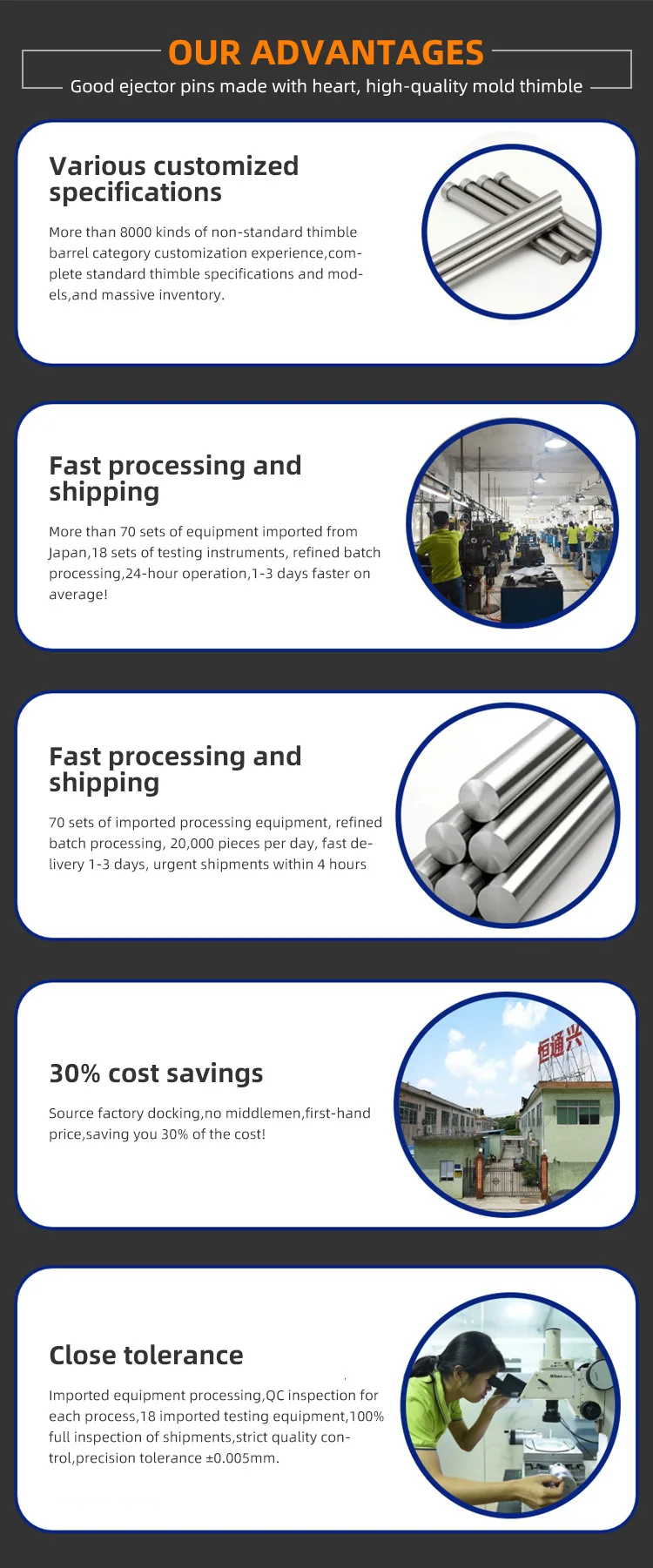 Order Process | Customer inquiries → Provide Spec./CAD/3D drawing → Engineer check and quote → Offer PI → Customer Send PO → 50% advanced payment(100% for First time cooperation) → Factory production process → QC passed → Packing and deliver at the first time → Fly to customers' hands soon! |