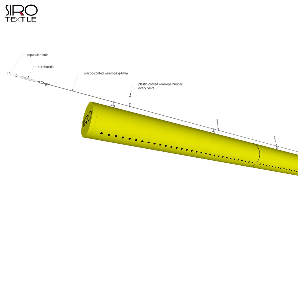 Everything is included in a Fabric air dispersion system | Many functions known from conventional metal ducts are fully integrated in a fabric air dispersion system, making diffusers, grilles, dampers, etc.is redundant. Fabric dispersion systems are all inclusive. You can forget about the following when using fabric air dispersion systems: 1).No extra grilles or diffusers are necessary. The fabric air dispersion systems function as both a duct system and as an air dispersion system. 2).No extra noise reduction is needed (except perhaps reduction of fan noise). Noiseless is the standard. 3).No inconvenient alterations or assembly on site. A fabric air dispersion system fits straight from the factory, is assembled with zip fasteners and is ready for installation as soon as it arrives. 4).No damper is necessary. A fabric air dispersion system does not require balancing. 5).Painting is not necessary as the fabrics are dyed. 6).No extra insulation is necessary. Fabric air dispersion systems are condensation free. | ||||||