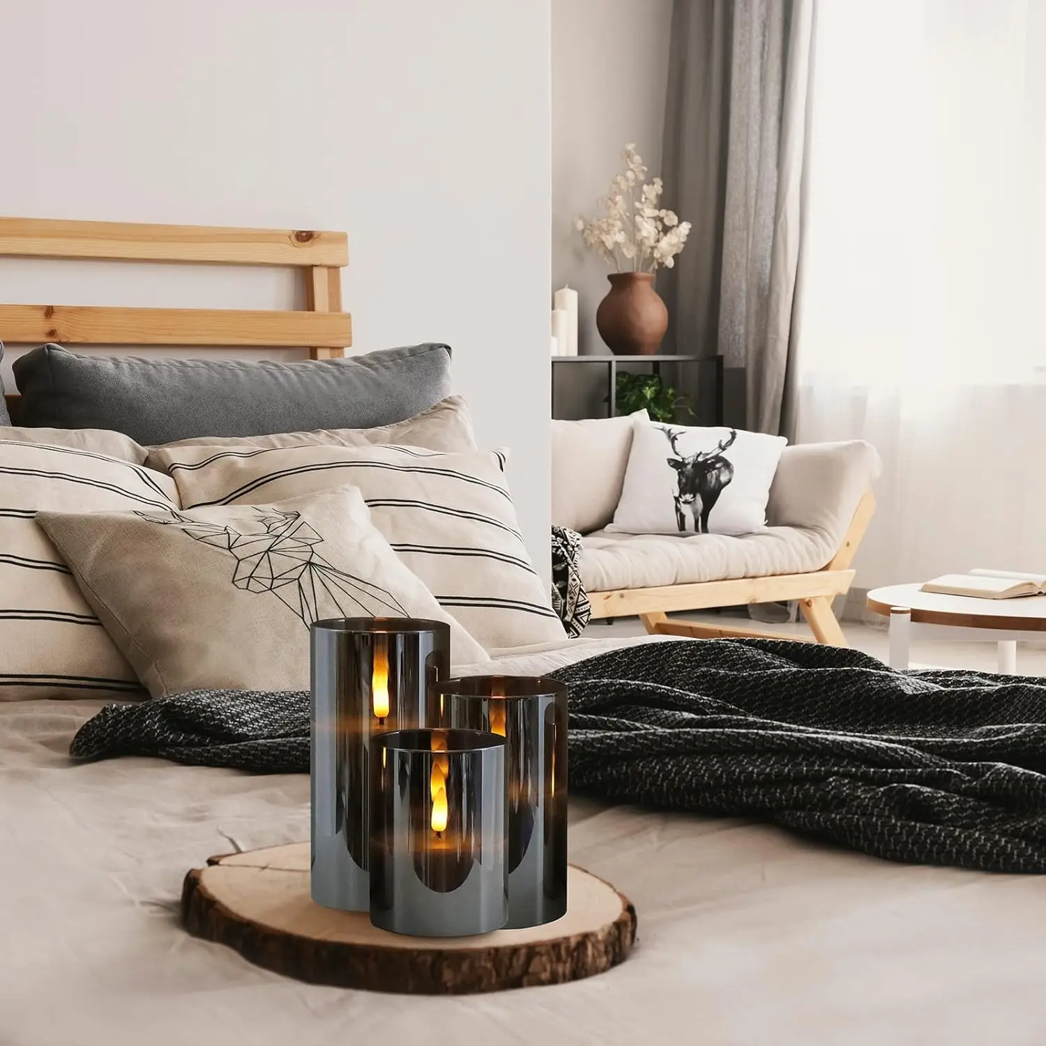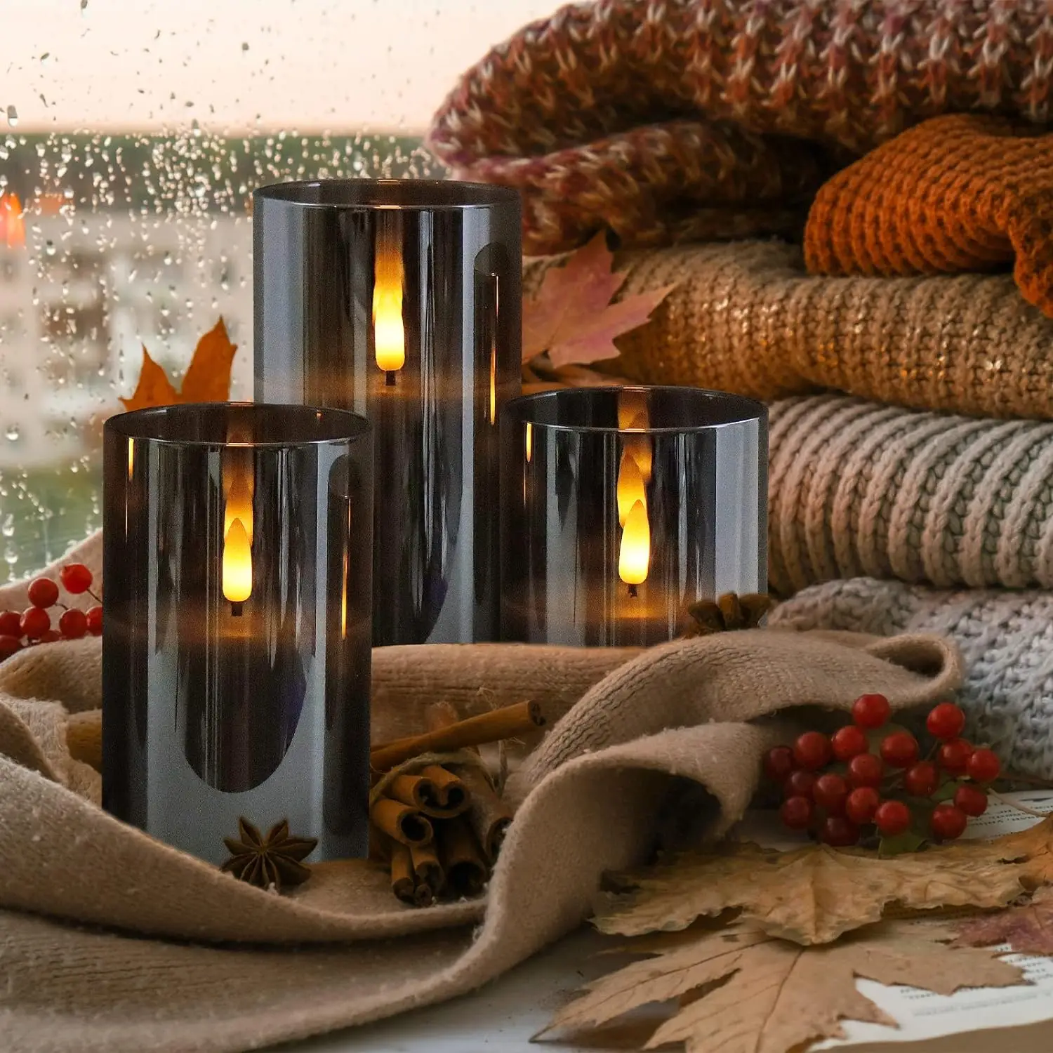 The following is a detailed description of the set of 3 grey glass LED candles.