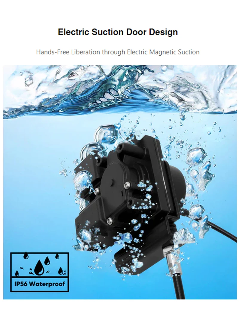 Features · Custom Fit: Tailored for specific vehicle models, easy installation without altering the original structure. ●Silent Door Closure: Experience a noise-free door closure, preserving the tranquility within the vehicle and contributing to an overall refined driving environment. · Safety Anti-Pinch: Incorporating an intelligent anti-pinch algorithm, the system immediately halts in the event of resistance during the automatic door closure process. With two stages of sensitivity (approximately 1.5kg initial pinch force and approximately 2.5kg secondary anti-pinch force), this smart safety feature ensures the well-being of users. · Multiple Control Methods: Unlock your front trunk using various convenient methods, including the central touchscreen and mobile app functionalities. This diverse range of control options adds flexibility and ease to your user experience. ● Automatic Suction Lock: Gently push the front trunk door to a semi-locked position, and it will automatically engage and lock without the need for forceful closing.This elegant and intelligent feature eliminates the risk of forceful door closure, ensuring safety and reliability without damaging the vehicle door. ·Waterproof Design(IP56):Achieving a waterproof rating of up to IP56, this system ensures reliable performance even in wet conditions, enhancing the overall durability and functionality of the product. · Enhanced Driving Experience: Beyond silent door closure, it provides an automatic suction lock for added safety and convenience. ·Material Assurance: High-quality alloy ensures strength, while automotive-grade wire cores and a specialized motor guarantee performance and durability. · Intelligent Safety:Incorporating an intelligent anti-pinch algorithm, with an IP56 waterproof rating, ensuring safety and reliability under various conditions.