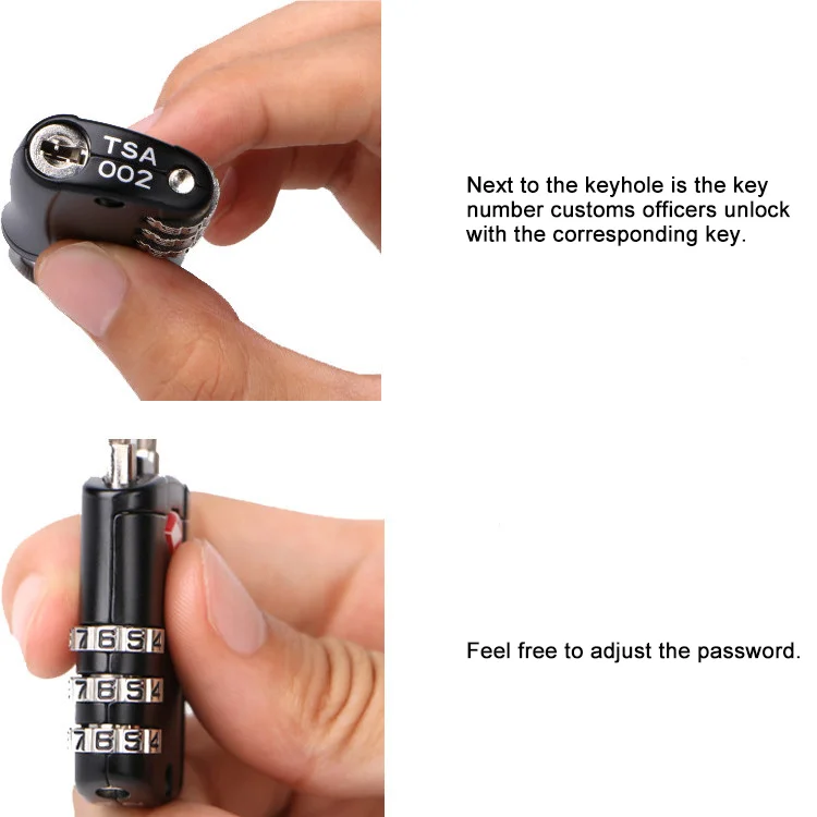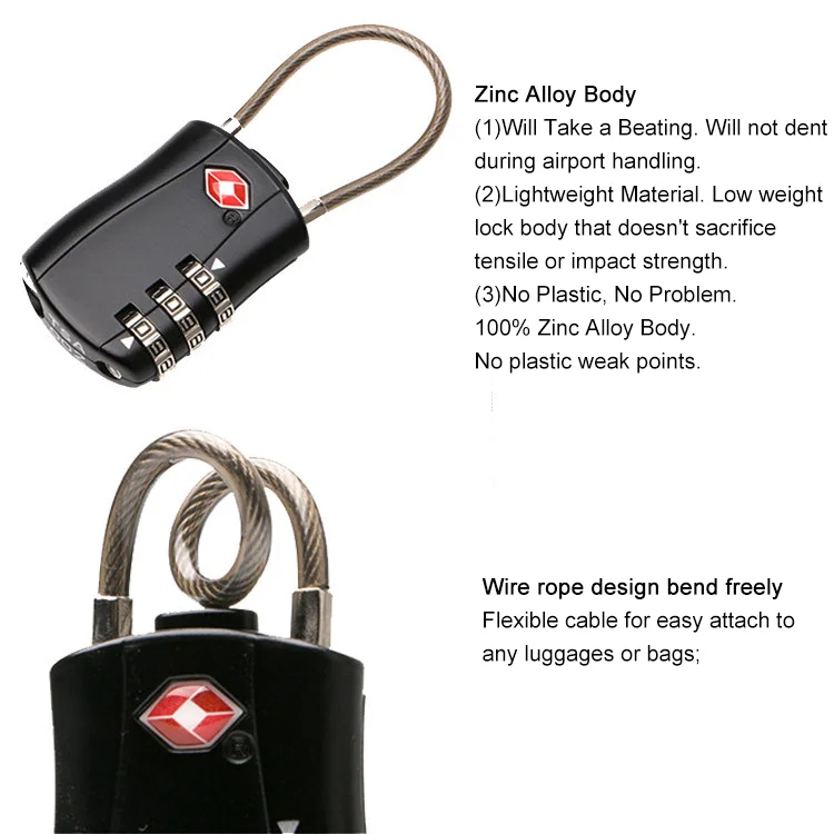 Material:Zinc alloy boy, steel cable Dimensions:80*30*10 mm Color:black, blue, green, orange, red, pink, yellow or customized Features 1.TSA Approved: can be opened by TSA agents without breaking it,examine your luggage, and then relock again. 2.Easy to set 3 digit combination, no key to loose. This lock allows you to set your own combination. It takes seconds and with 1000 possible combinations to choose from you know that this combo tsa lock is secure. 3.Durable Zinc Alloy casing and ultra-strong steel cable. Every single lock is hand tested before it leaves the factory.
