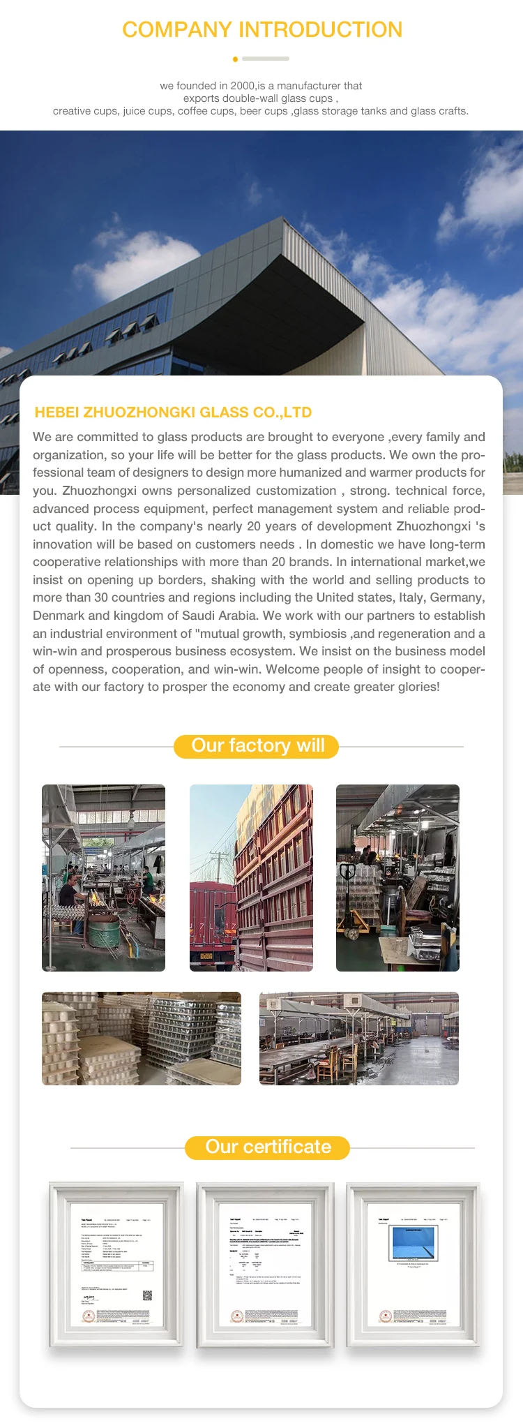 Our company mainly produces double wall glass cup,glass jar,glass tea sets,glass coffee sets,glass household products,glass crafts etc.Our company 's items reach 90% to export,and the main markets include the United States,Canada,and other countries.