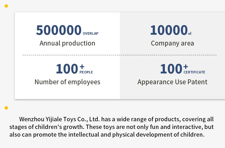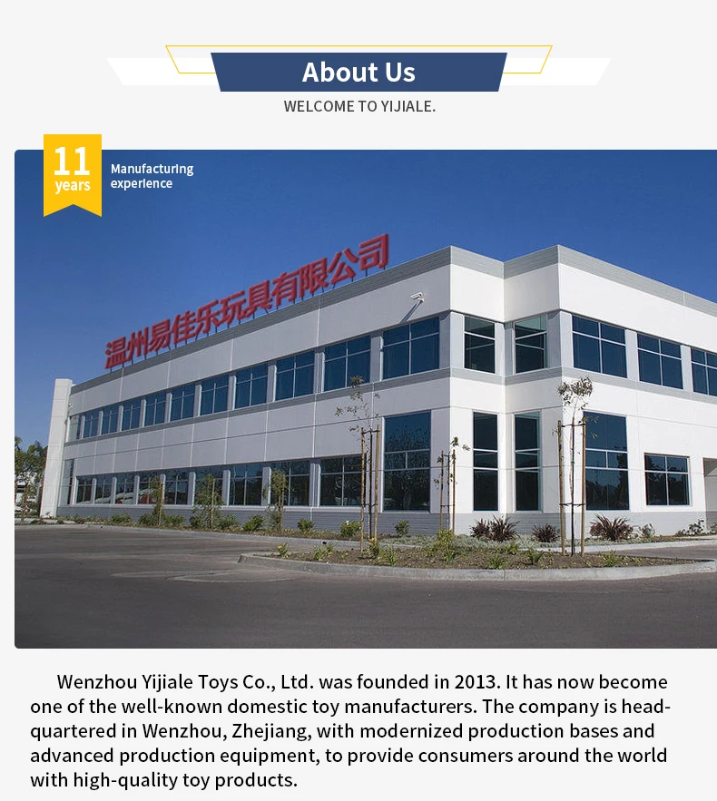 Wenzhou Yijiale Toys Co., Ltd. was founded in 2013.lt has now becomeone of the well-known domestic toy manufacturers. The company is head.quartered in Wenzhou, Zhejiang, with modernized production bases andadvanced production equipment, to provide consumers around the worldwith high-quality toy products.