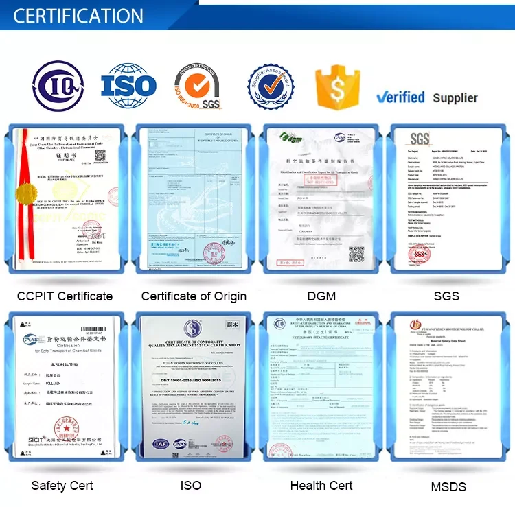 XIAMEN HYFINE GELATIN CO,.LTD is the family member in HYFINE GROUP LIMTED. Quality is our culture. Based on 20 years experience in gelatin production, we have expanded to produce animal protein and animal glue with 4 production lines, 500+ staffs and thousands of customers. 90% of our production equipment is imported from Germany to offer our customers the best competitive products. Strict test before delivery ensures consistant gelatinized products. Professional service teams offer you good service. With us your money in save, your business in save. We have been qualified with the certificate of SGS, ISO, CQC, MSDS, VET and HALAL. |
