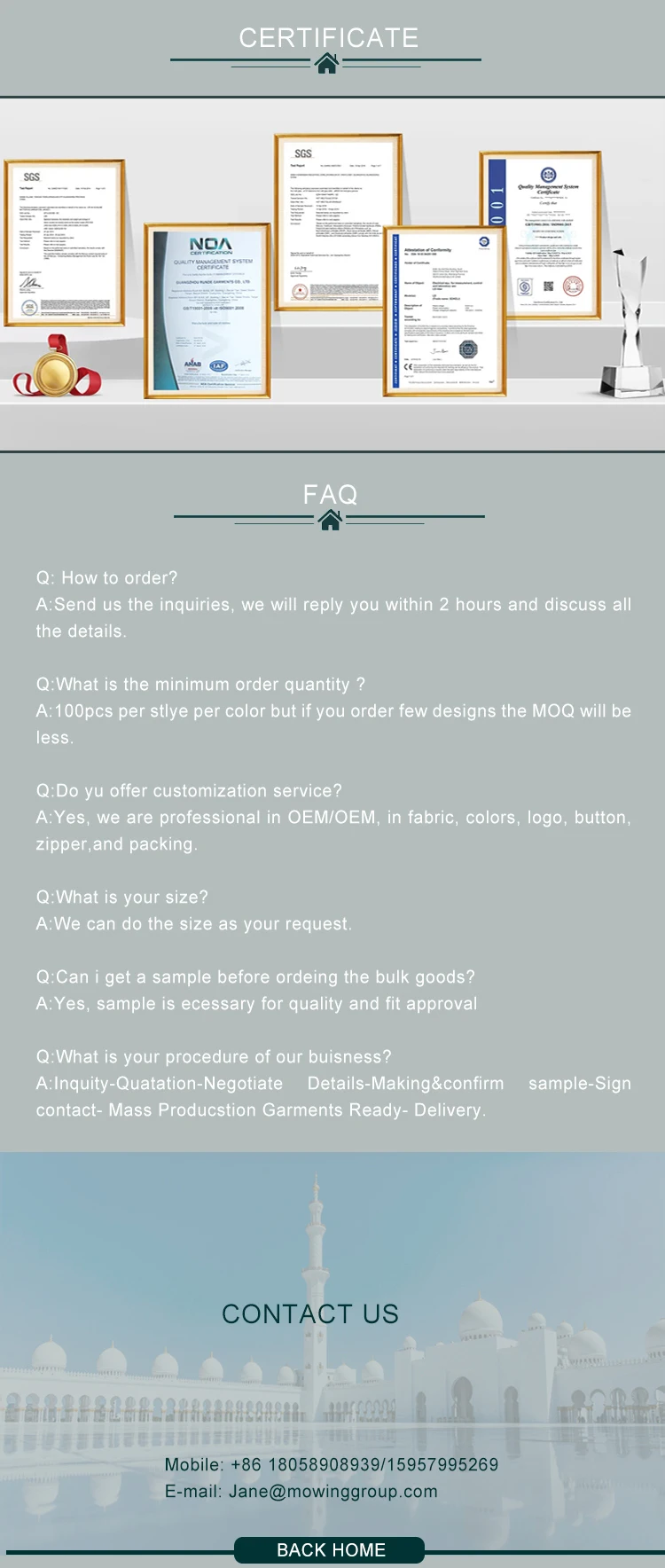 MOQ | 100pcs per style per color per styles but if you order many styles the MOQ will be smaller. | ||||||