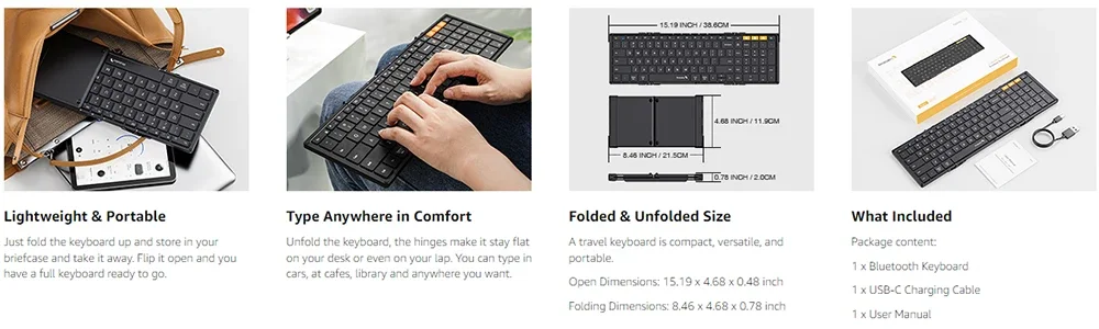 The non-slip pads at the bottom keeps the keyboard balanced and stable, it won't move when typing 150 days Standby 2 Hours Full charged 100,1000 Times Folding Action,5 Years Aluminum Hinges