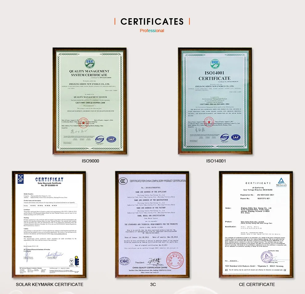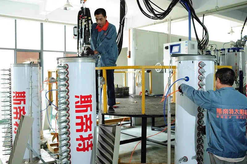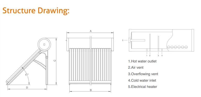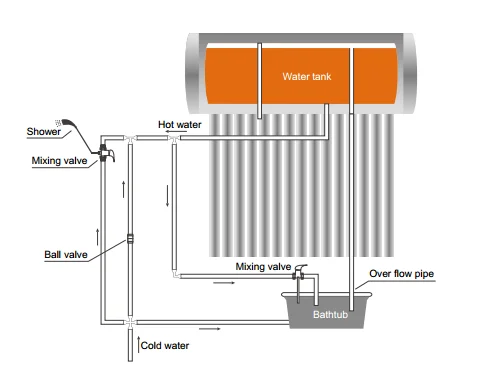This model operates to feed water automatically. Using thermostatic system- depending on the different density between solar hot water heater and cold water, a water flowing cycle is created in the tubes. Hot water flows automatically upwards while the cold water flows down. The water in the storage tank will be heated from this nautal circulation.