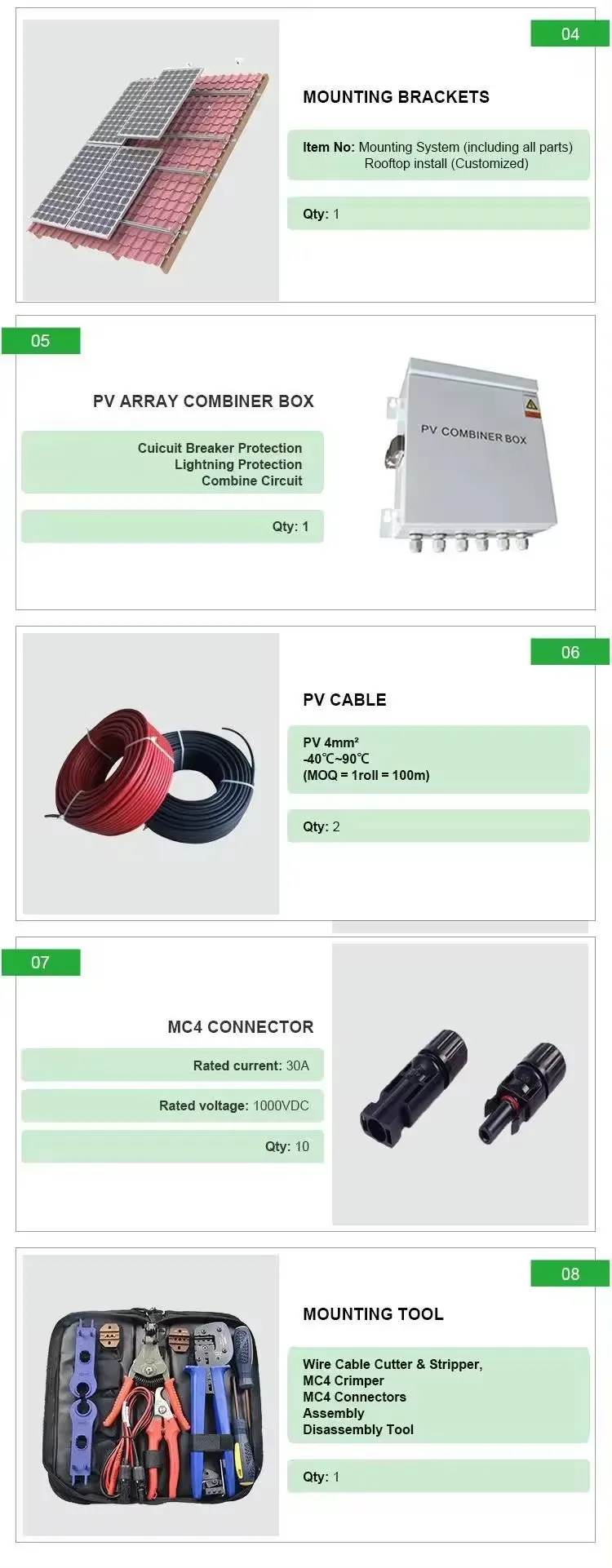 4 | Mounting Bracket | 35 m/s wind speed/ 1.5KN/m2 snow load /Ground or roof or carport mounting bracket optional |