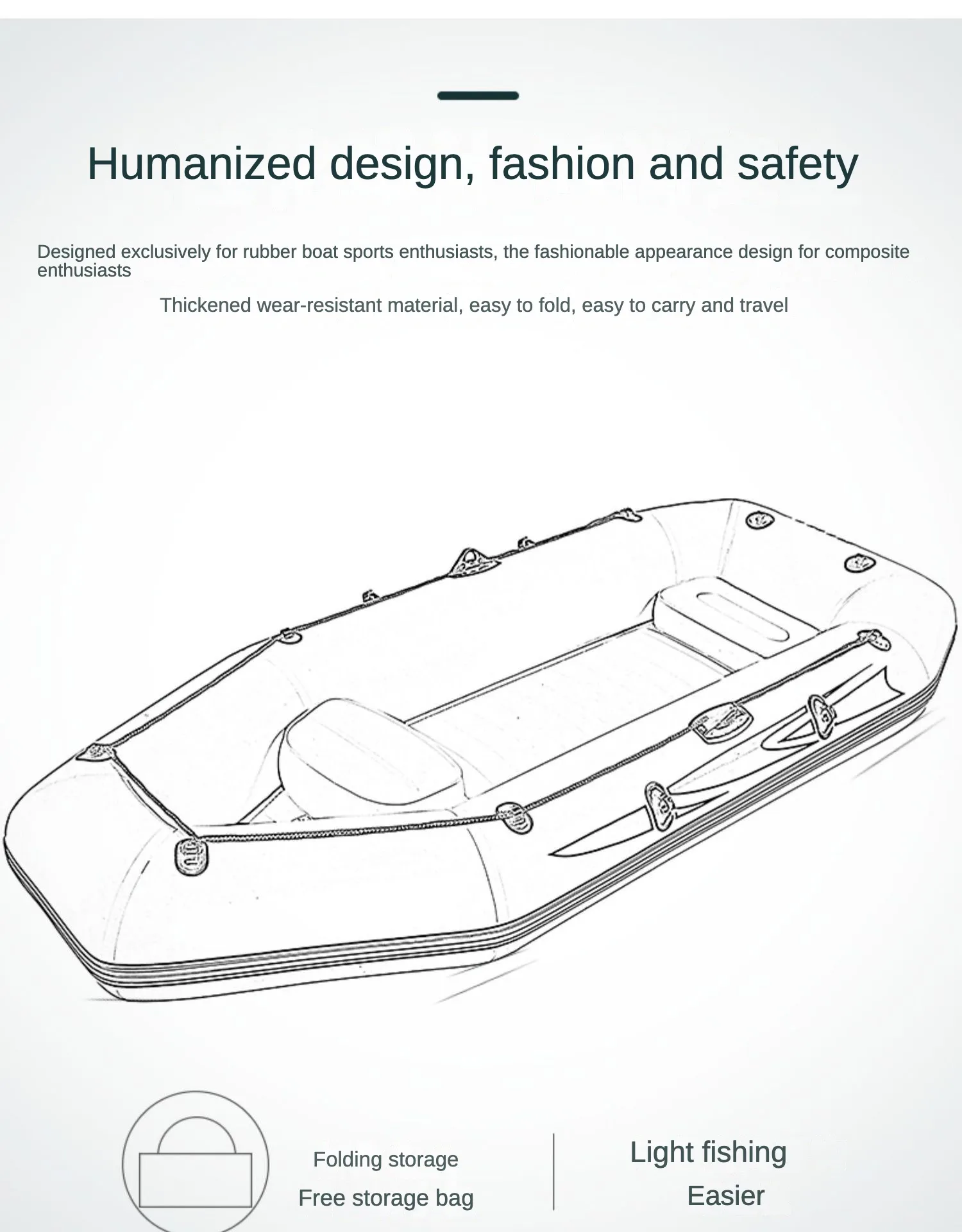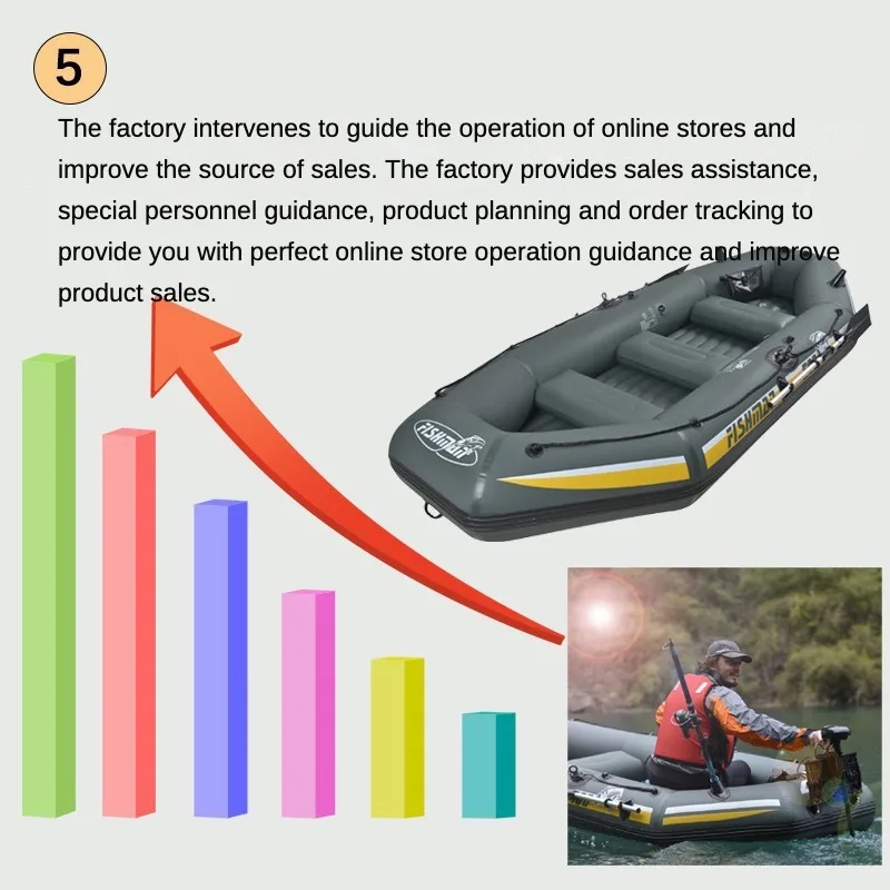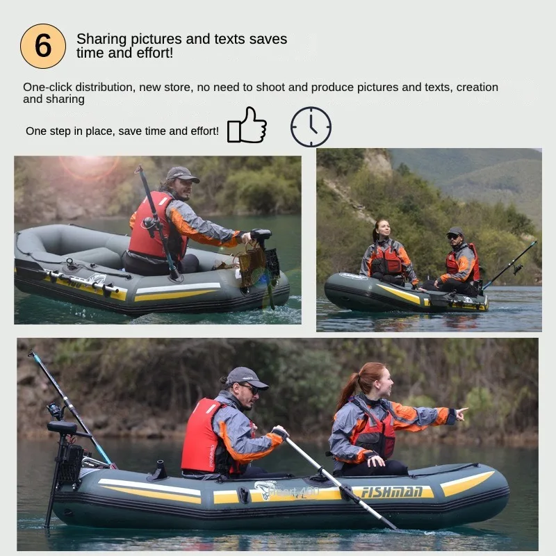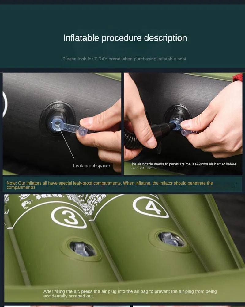 Standard accessories: hand pump, paddle, instruction manual, boat rope, fishing seat, tool kit, repair kit, etc.