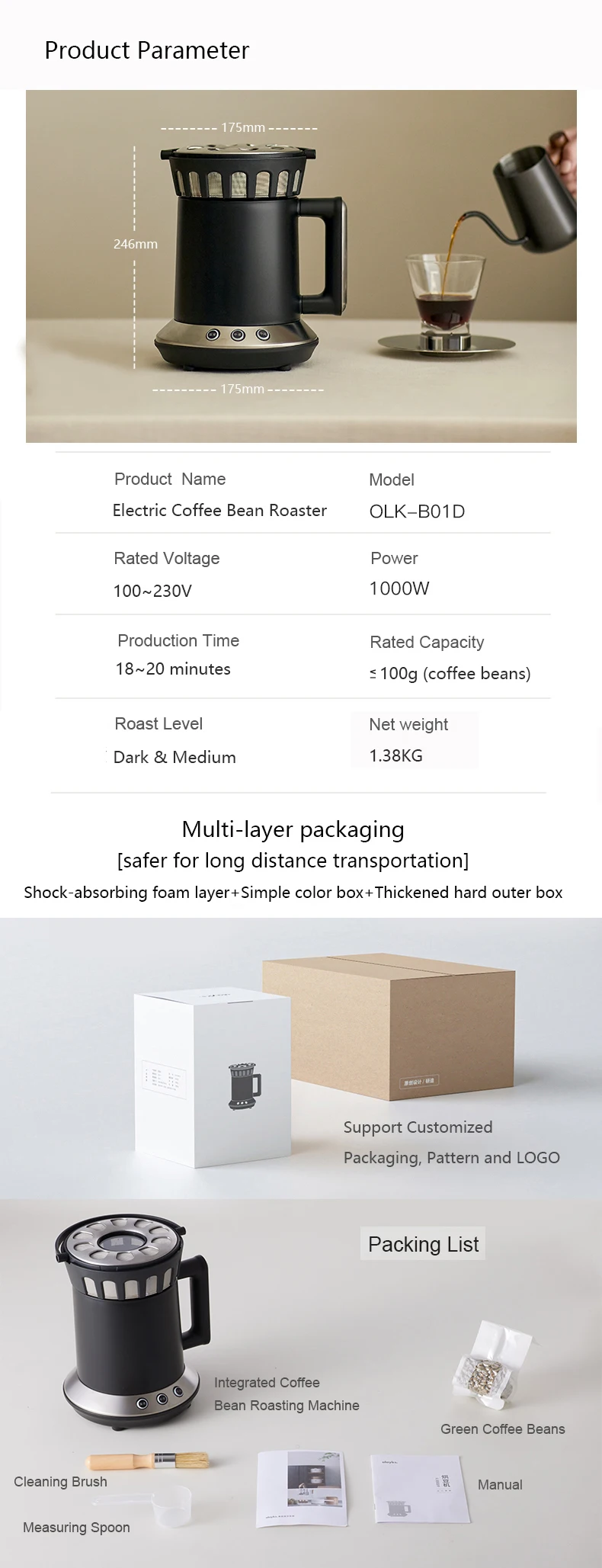 1 | Capacity: max. 100gPlace 80g ~ 100g green bean per time, Roughly 3 spoons. | |||||||