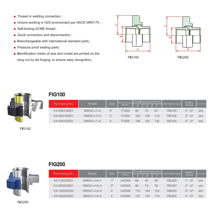 2,000 psi cold working pressure Recommended service General service manifolds and lines A: the union of compact structure, widely used in low-pressure well pipeline, can also be used in the medium pressure range of air, water, oil or steam applications requirements. B: the available models use the welding Sch.40. C: type 200 Hammer Union, 2000PSI NSCWP, the test pressure 3000PSI blue nut, grey parts