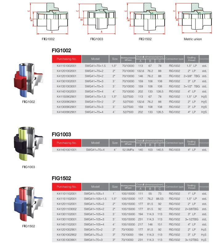 2,000 psi cold working pressure Recommended service Manifold line connections, suction service, and corrosion service A: the union of compact structure, widely used in low-pressure well pipeline, can also be used in the medium pressure range of air, water, oil or steam applications requirements. B: the available models use the welding Sch.40. C: type 2006Hammer Union, 2000PSI NSCWP, the test pressure 3000PSI blue nut, grey parts.