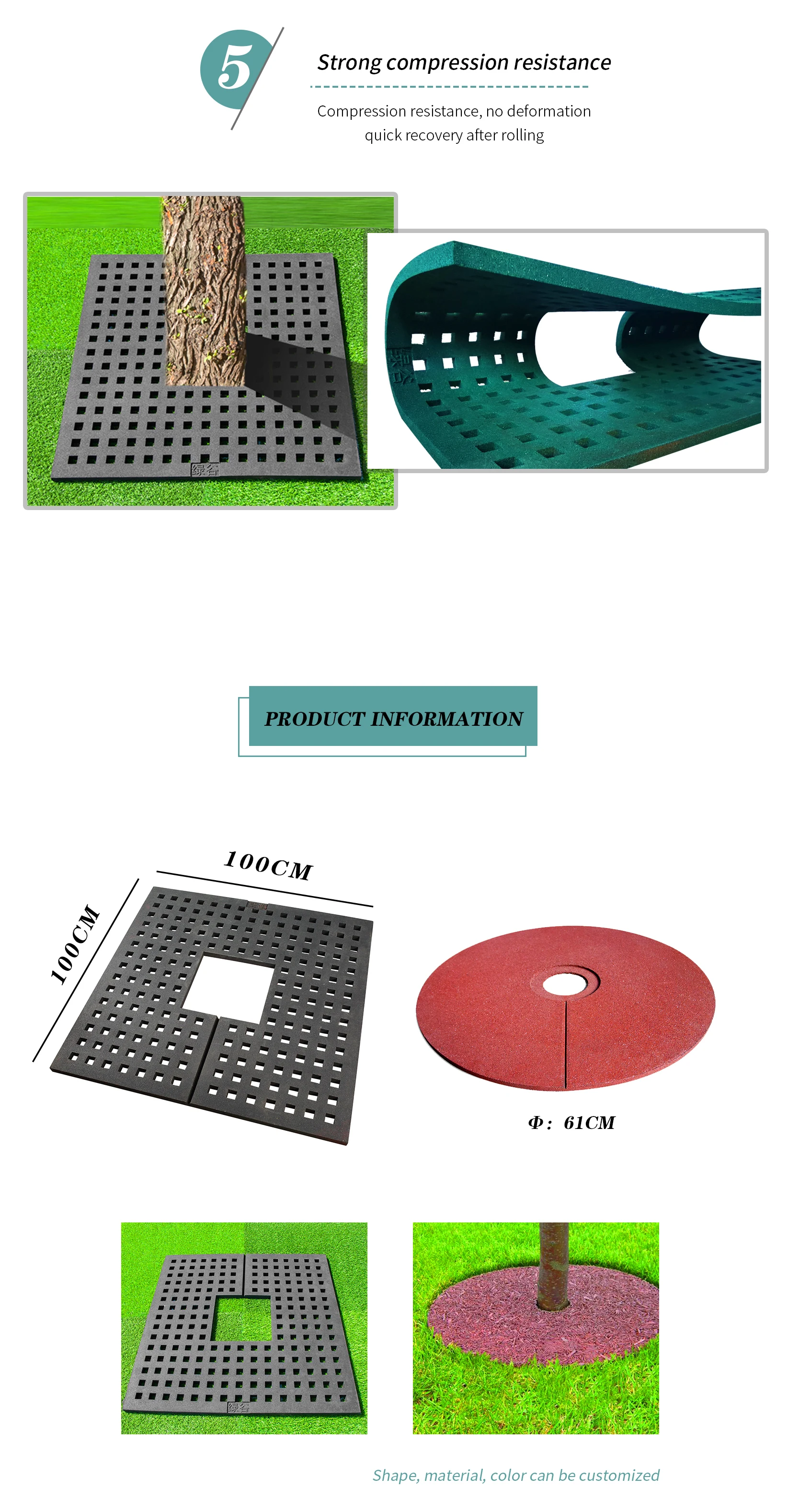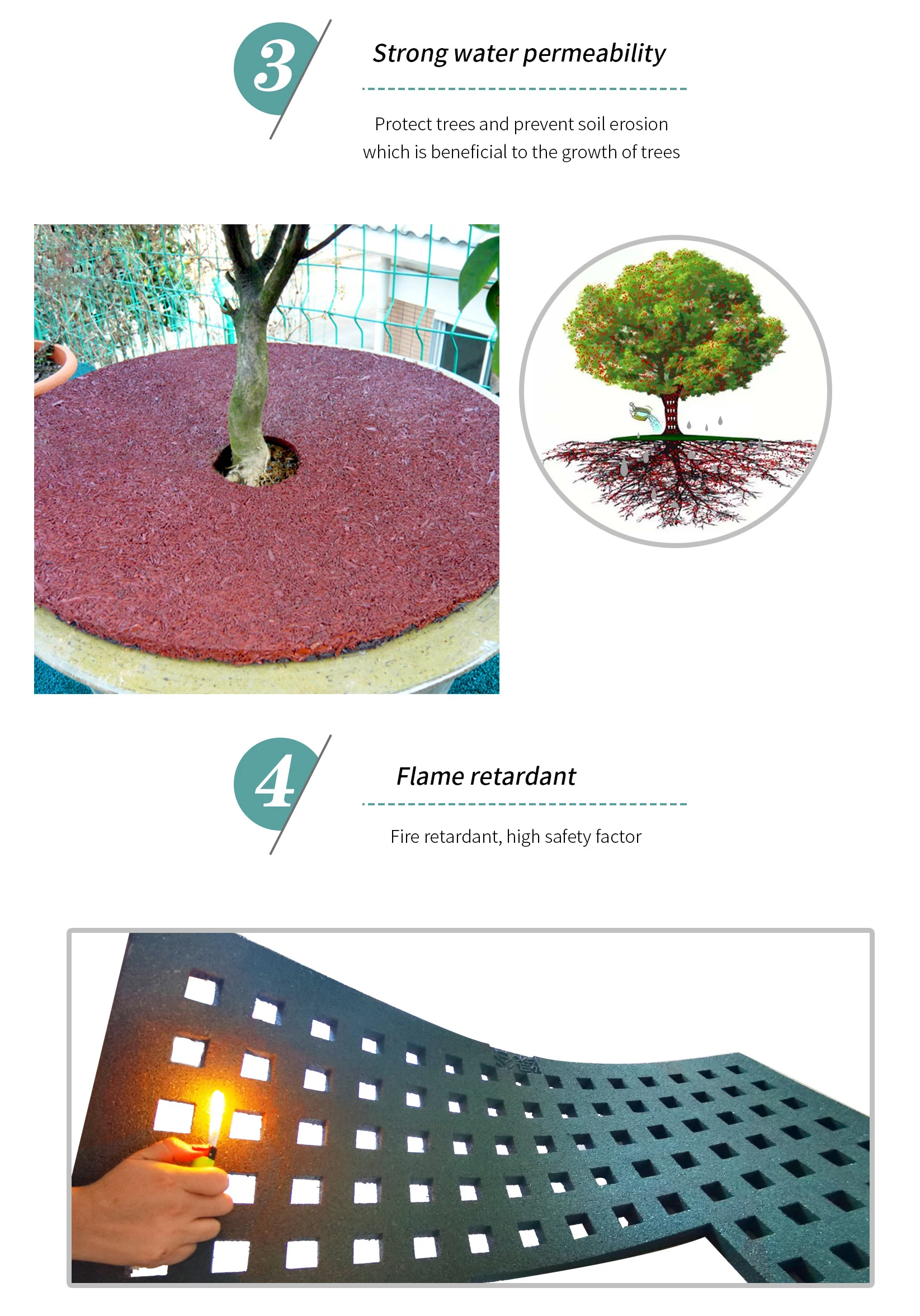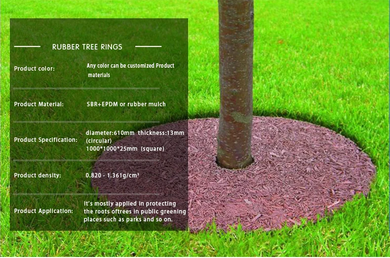 Usage | Put around tree root to protect it, keep moisure of the ground and prevent weed growing. Rubber mulch is an environmentally friendly alternative to wood mulch. The rubber mulch is made from recycled tires, it eliminates the need to replace your faded mulch each season. Rubber mulch is maintenance-free, can be easily cut to size and will not discolor, decompose or blow away. |