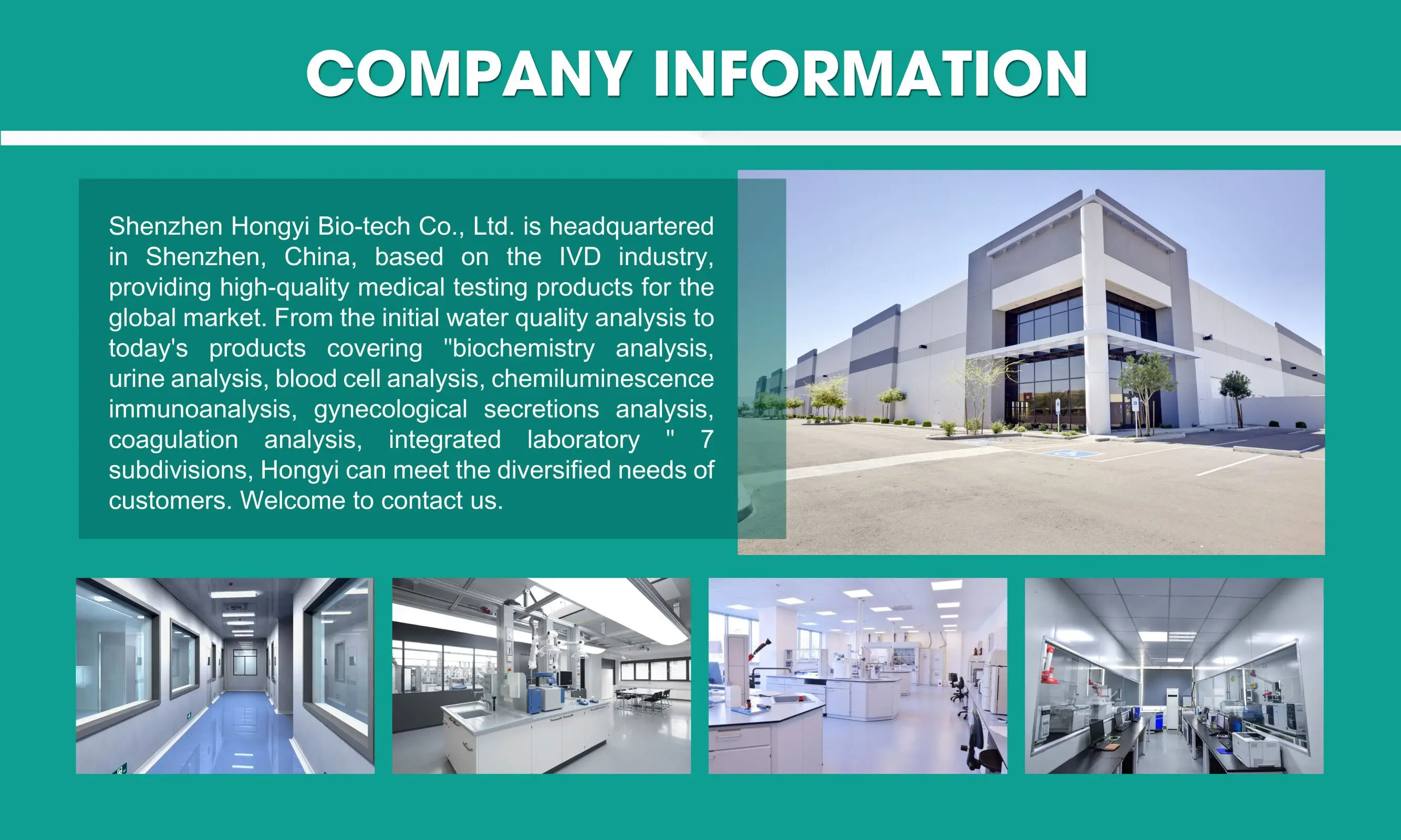 Shenzhen Hongyi Bio-tech Co., Ltd. is headquartered in Shenzhen, China, based on the IVD industry, providing high-quality medical testing products for the global market. From the initial water quality analysis to today's products covering "biochemistry analysis, urine analysis, blood cell analysis, chemiluminescence immunoanalysis, gynecological secretions analysis, coagulation analysis, integrated laboratory " 7 subdivisions, Hongyi can meet the diversified needs of customers. Welcome to contact us.