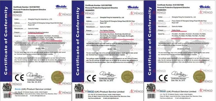 made of flame-retardant rubber, non-slip, anti-electrical, puncture-resistant, fireproof, waterproof, oil-proof, anti-smashing and anti-puncture, steel midsole, steel toecap, with good protection for the bare foot and foot surface. With breathable sterilized canvas lining, and breathable sponge insole. The above products are all in line with the standards of EN ISO 20345, and can be used in conjunction with fire fighters' protective clothing.