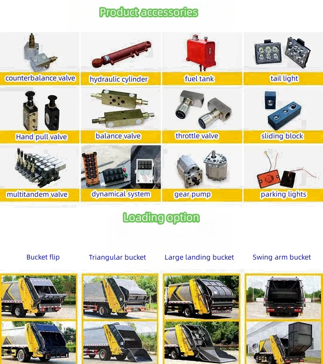 Dual insurance system: The operating system has dual functions of computer control and manual operation, greatly ensuring and improving the utilization rate of vehicles. Change the position of the pressure regulating valve to prevent customers from adjusting the pressure without authorization. Install warning signs on the power take-off to remind customers to switch on and off the power take-off to prevent damage to the power take-off. The tail can be optionally equipped with a flip mechanism with a garbage bin (or bucket)
