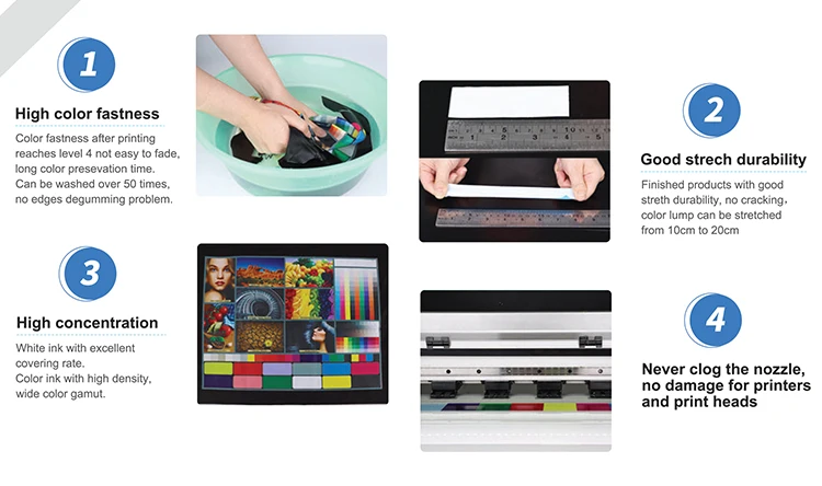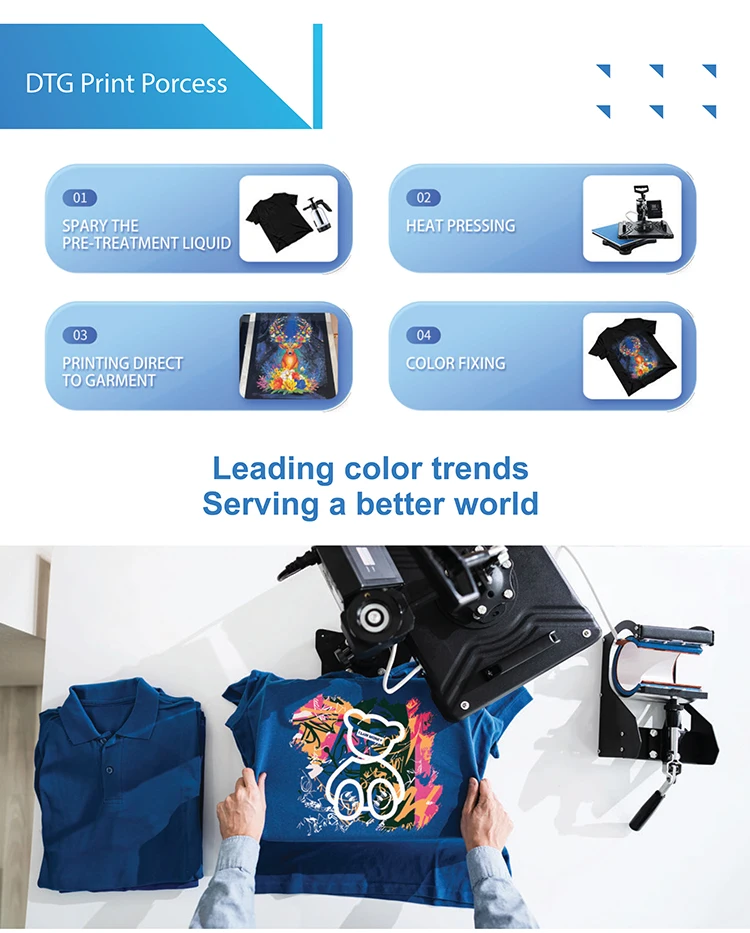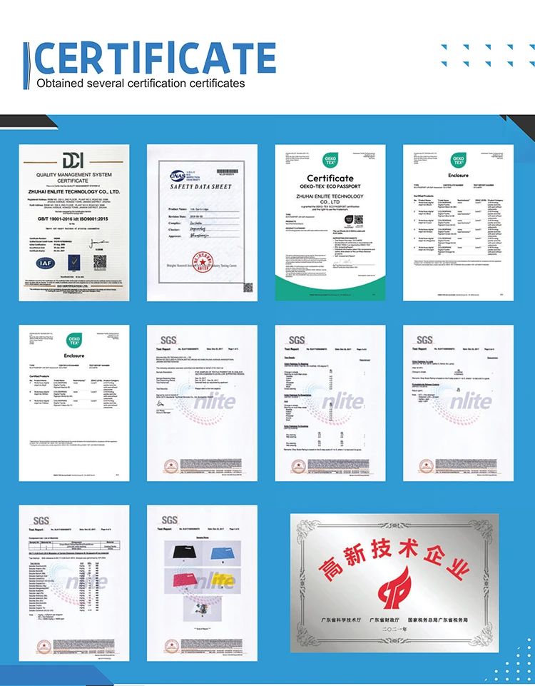 Our Ink factory has more than 7 years of production experience. The R&D team includes in development team with more than 10 bachelor's and master's from China, Japan and United states. In addition, we also set up a laboratory in Japan.We keep paying high attention to ink quality. Independent development of key materials to improve technical content and reduce cost, avoid raw materials shortage for smooth production process. At present, the annual production capacity exceeds 6,000 tons. The market share of DTF ink ranks at the forefront in China market. Meanwhile, we are manufacturing wide application of digital ink, including digital DTG textile ink,DTF ink, DTG pigment ink for belt machine, packag- ing ink, pigment ink. The products have obtained OEKO-TEX®-ECO PASSPORTcertifcation enables the products workthrough worldwide. We not only focus on improve product quality, but also use large-scale production to make complete models with favorable prices and better quality. We pay more attention to provide VIP exclusive customer service by solve related problems for you. By provide high-quality one-stop service, so that you can buy with confidence and use it with ease.