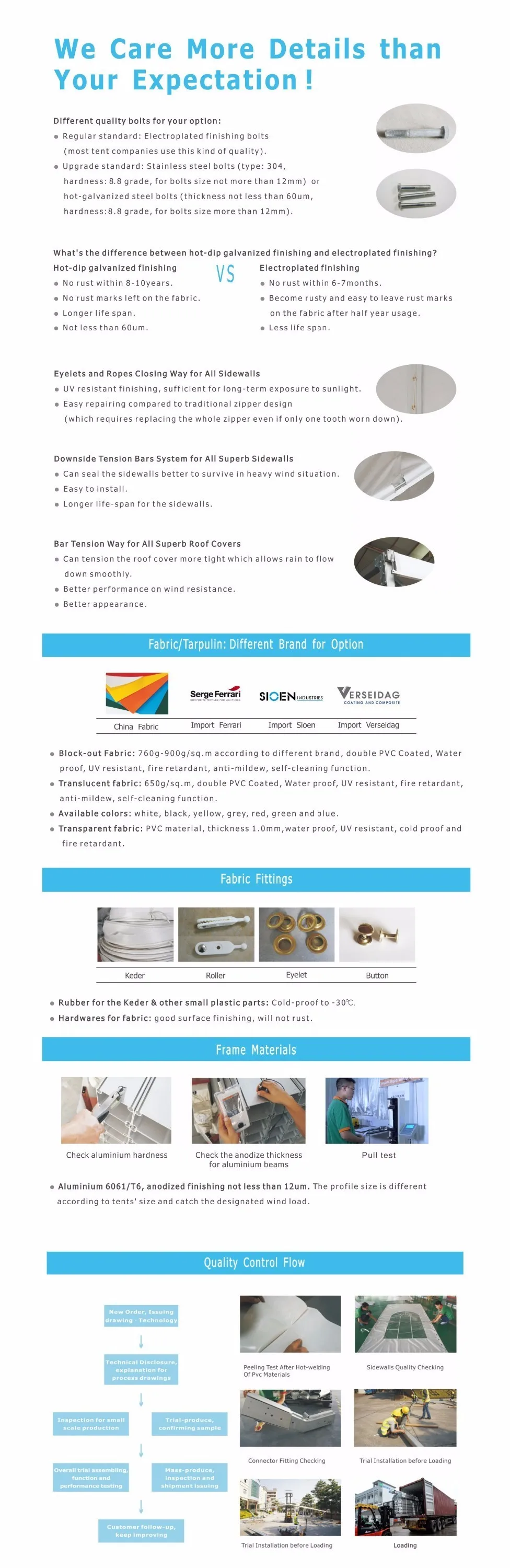 Our tents are thoroughly confirm to the strictest European and the Austrialia quality standards, life span of aluminum alloy is 20-30years, PVC roof and sidewalls is 10 years.