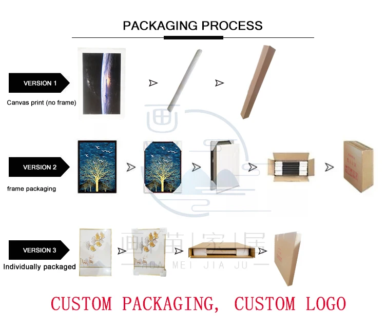 Packing: | 1.Canvas with frame: protective corners and wrapped with bubble bag, then packed in a strong carton with foam. 2. Customized packages are acceptable and welcome. | ||||