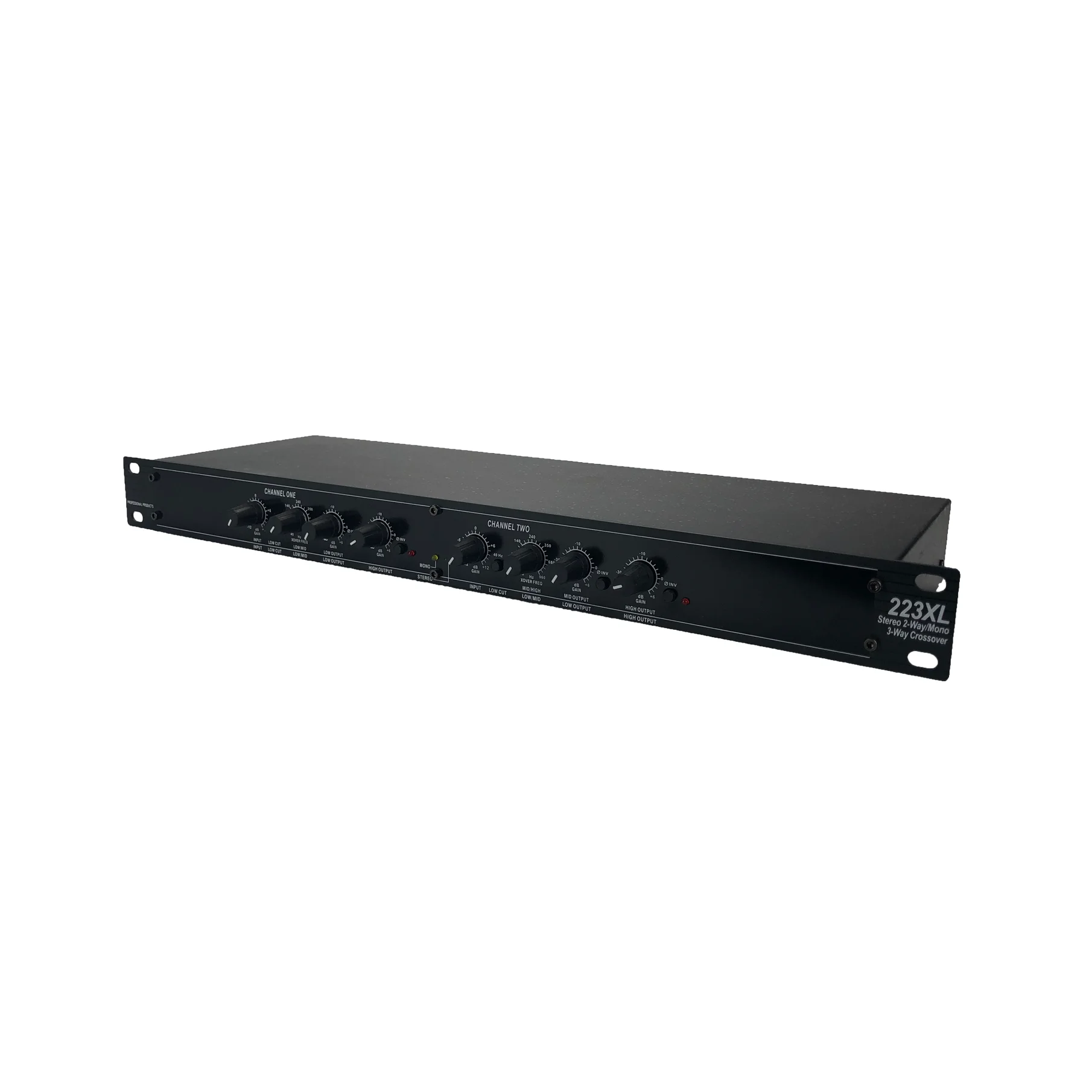 * XLR balanced ins and outs * Mode switch for stereo 2-way or mono 3-way operation * Low frequency summed (subwoofer) output * x10 range switch on both channels * 40Hz high pass (low cut) filter both channels * Phase reverse switch on all outputs * Individual level controls on all outputs * 24dB per octave Linkwitz-Riley filters (the professional standard) * Stereo/Mono status LEDs indicate the selected mode * CSA NRTL/C approved