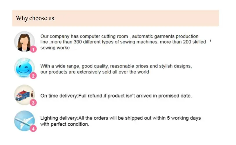 Can Ihave the clothing with my own logo/label/tags? | Yes, of course you can, and please provide digital file and size of your logo/label/tag.More than 60 pieces persize are required for custom products. | |||||||