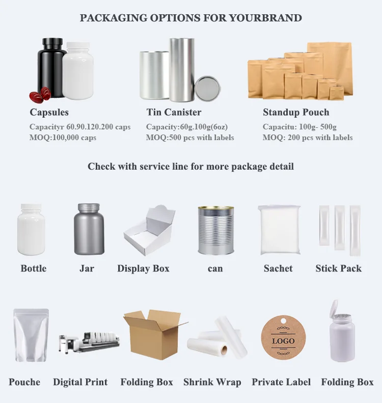 Cooperate | OEM | Bags: Packed by 60g/bag ,100g/bag, 8oz/bag,1kg/bag,25kg/drum according to your need. Capsule/softgel:60capsule/bottle 90capsule/bottle 120capsule/bottle | ||||