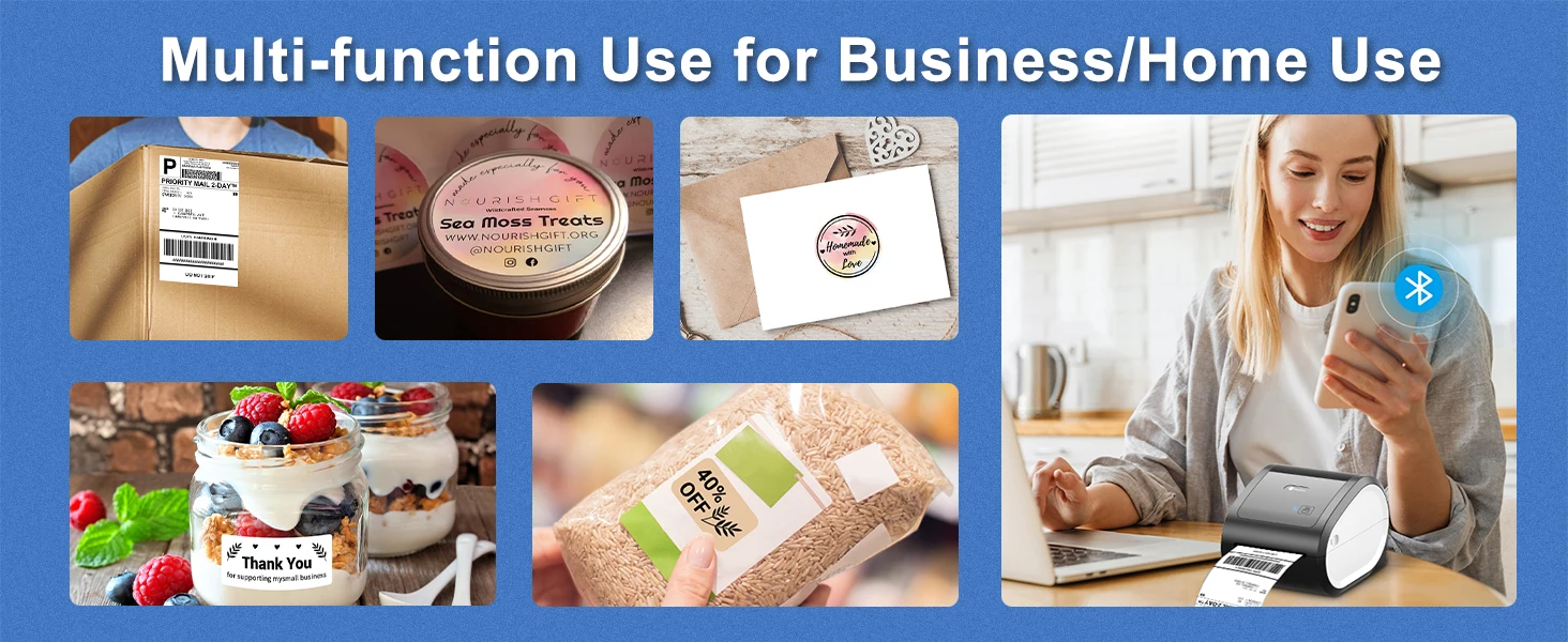 1.Easy BT Connection- BT label printer easy to connect with your phone and pads. Stable BT connection within 5 meters. Also can use USB line to connect with your computer. 2.Thermal Printer Fast and Reliable- D520-BT thermal label printer ultra-fast at 150mm/s. Average printing up to 60 sheets of 4"x6" labels per minute. Inkless printer don't require ink and ribbon and won't get your hands dirty. 3.Large Capacity of Paper Bin- D520-BT shipping label printer with 2 times larger upgrade capacity can hold 500 sheets of 4X6''. No need to change paper rolls frequently, making your printing more efficient. 4.Edit Freely on Our APP- D520 thermal printer works with our app "Labelife", provides 500+ templates and a large number of custom elements for DIY labels, supports WORD/TXT/PDF printing. 5.Good for Smalll Business- Compatible with most major shipping platforms including Shopify, Etsy, eBay, Amazon, Poshmark, Fedex, ShipStation, ShippingEasy, Shippo,Ordoro,etc. Good for starting your small business. 6.Works with Multiple Sizes Printing Labels- label printer prints labels from 0.78"to 4.4" wide. Idea for 4" x 6" shipping labels and barcode/postal/bulk mailing labels ect.