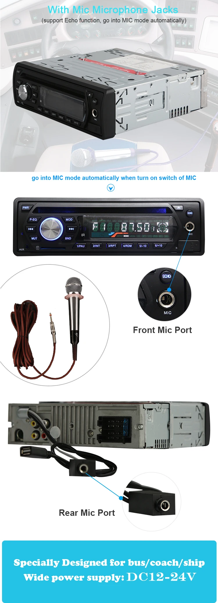 With front and rear Mic microphone jacks (support Echo function, go into MIC mode automatically) | |||||||||