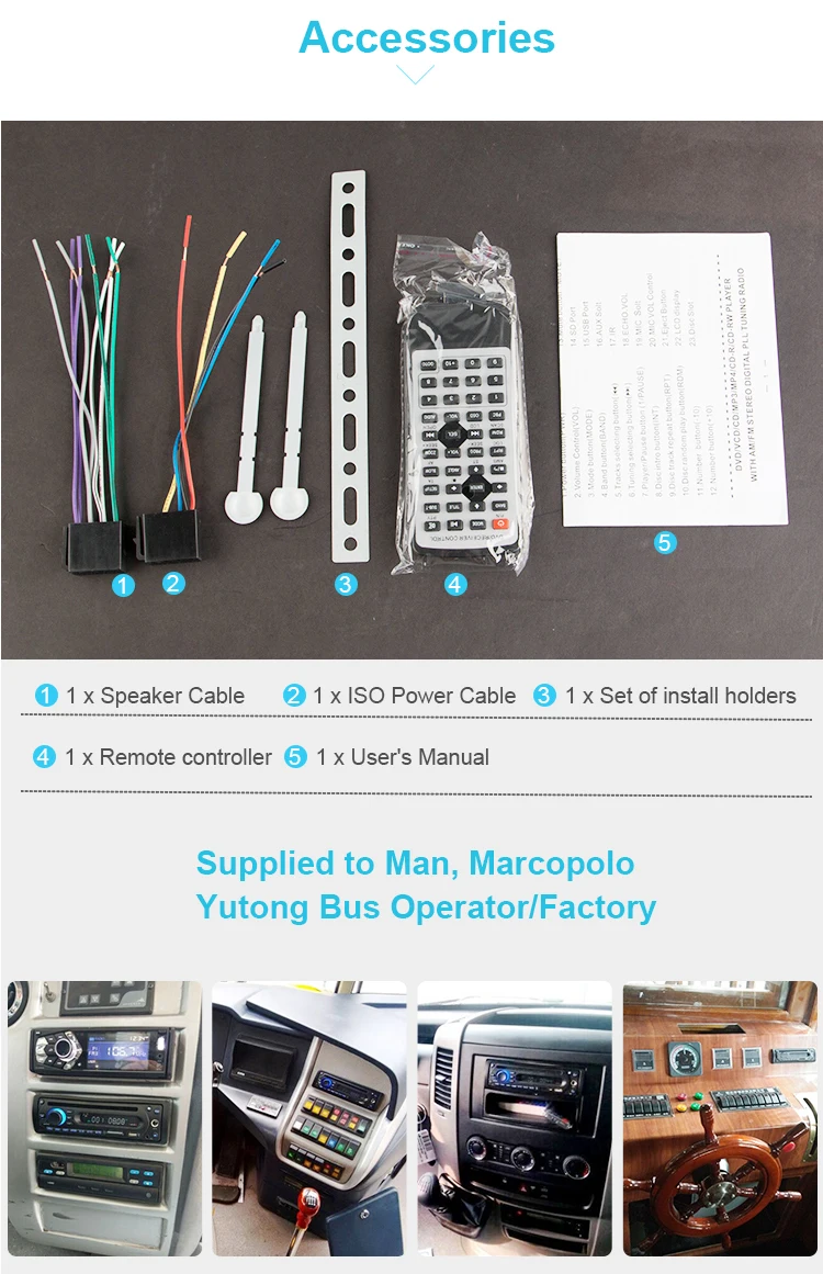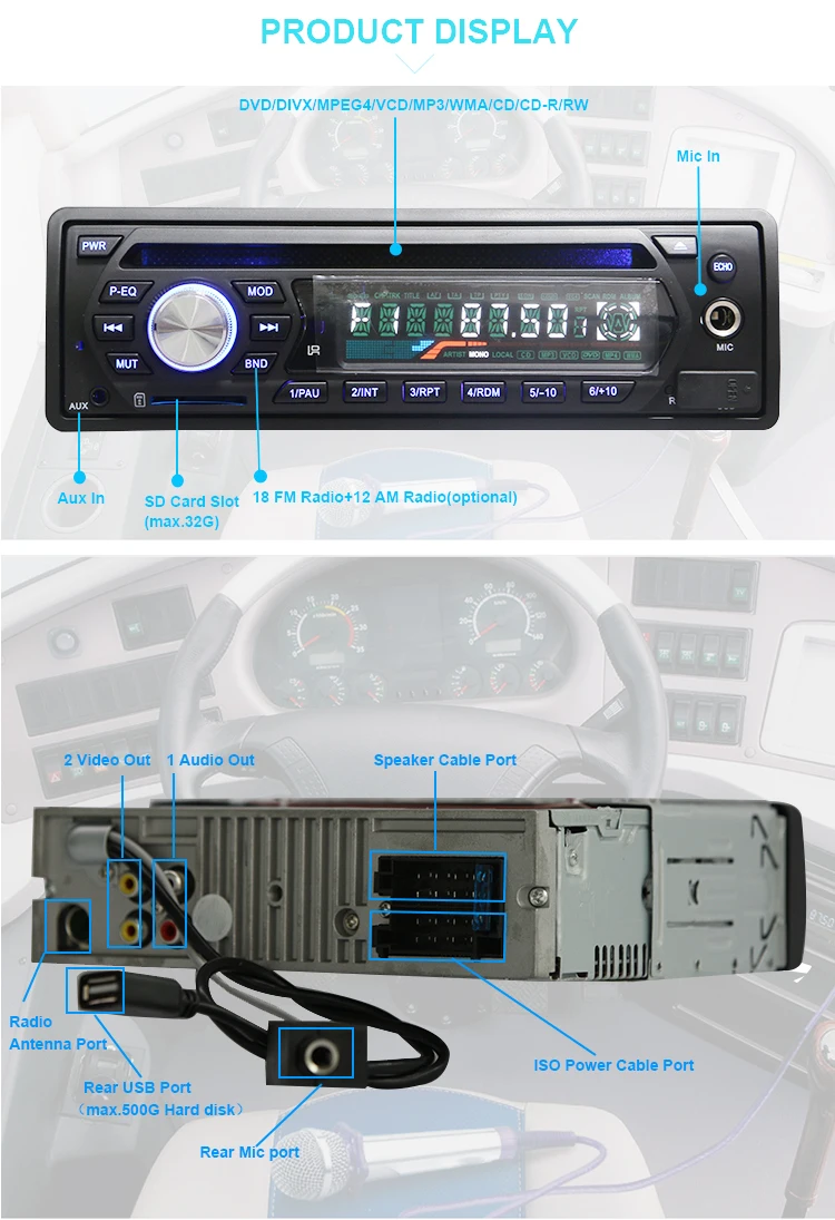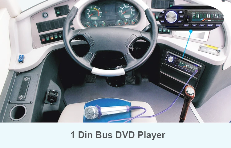 Product Name | One Din Bus DVD Player with Front MIC/ DC12-24V/ Support 500G Hard Disk/ SD/USB slot / FM Radio / Aux In | ||||||||
