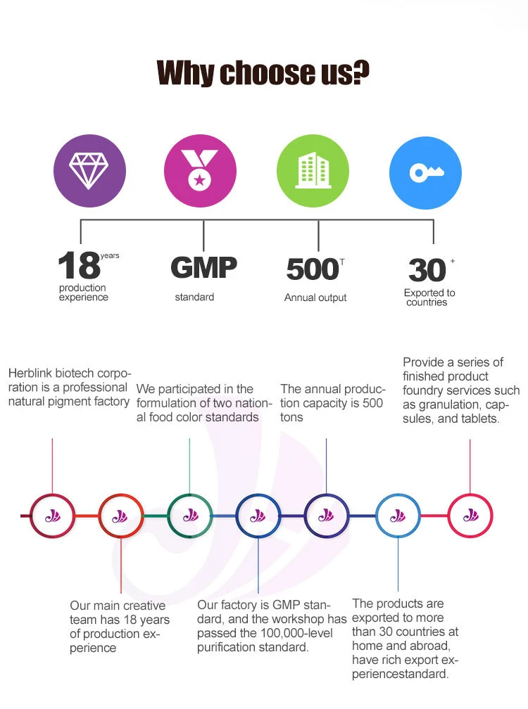Herblink is a professional plant active ingredient extraction manufacturer,The team includes several core members who have worked for large plant extract manufacturers. With nearly 20 years of industry experience, we share a common goal: To become a technology-driven new production enterprises, We focus on the deep combination of natural plants and modern biotechnology,optimize products to serve human health.Our products are mainly plant based extension products, For example, edible natural plant extracts, Natural pigment,Fruit and vegetable powder and other natural products. Because natural, safe and stable characteristics are more and more used in food, health products, cosmetics, pet food and other fields. We choose high quality natural materials, Improved process,Strictly manage the production process, Stable quality, Control the cost, Create profit and value for customers, To provide consumers with safe and stable products