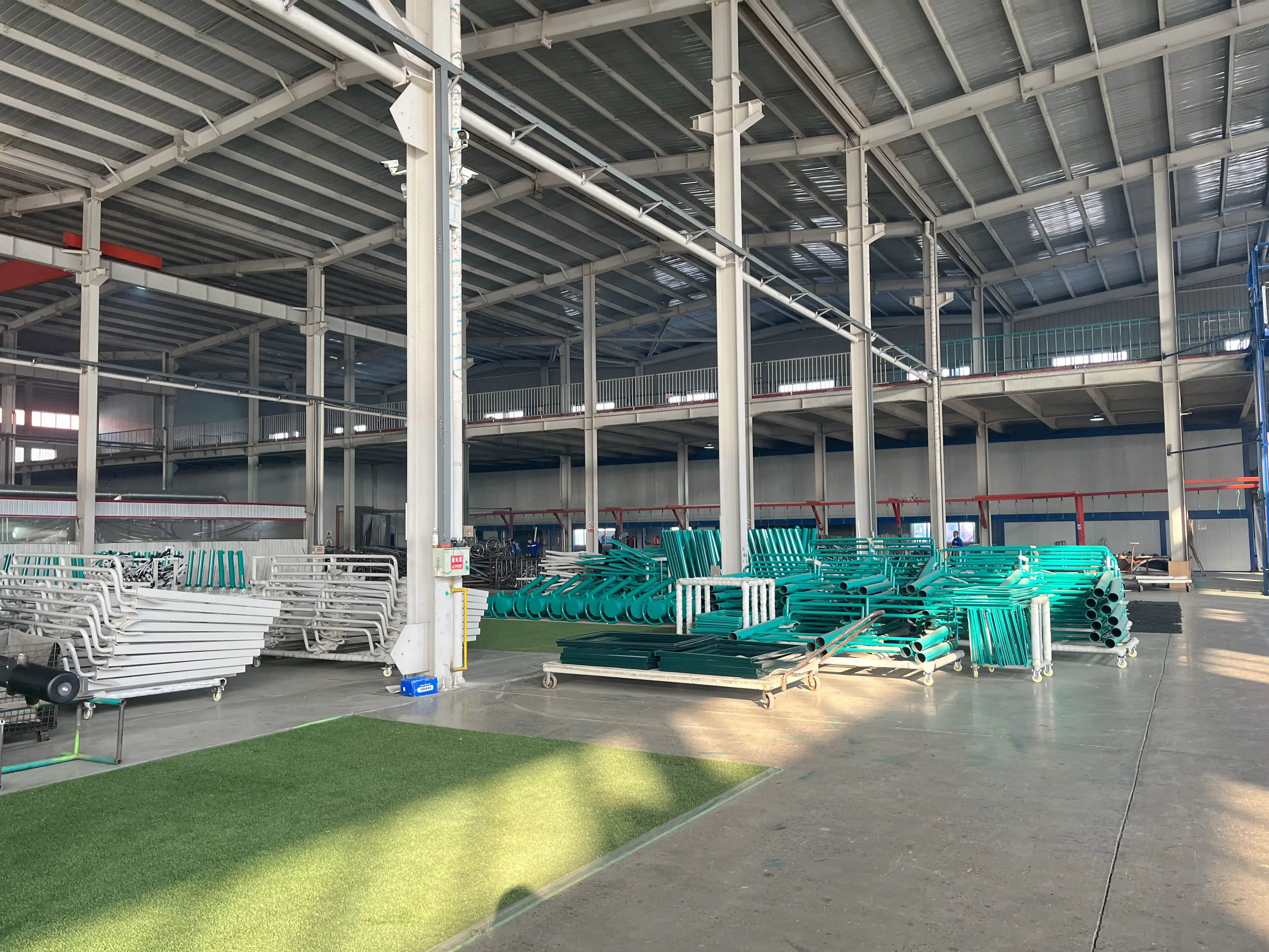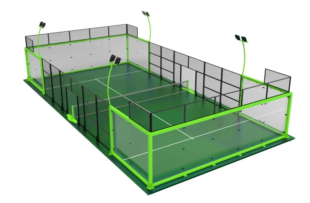 •Site specifications: 20m long, 10m wide. •Surface layer: 1. Type: artificial short grass; 2. Length: 12mm. •Tempered glass: Type: Special explosion-proof tempered glass 12mm; Size: Width 2000mm*Height 3000mm*18 pieces. •Pole and fence: 1. The verticality between fence columns, glass and the ground shall not be greater than 1°, and the overall space height shall not be less than 9 meters. 2. After the glass assembly is completed, the surface should be flat and smooth without any bulges. 3. The columns are made of Q235 hot-dip galvanized steel structure 100*50*3.0mm. The four-corner load-bearing columns are double columns with edge-wrapped design. The column spacing is 2000mm. The frame is made of Q235 hot-dip galvanized steel structure 60*40*2.0mm. Or, the four-corner columns are 100*100*3.0mm or 80*80*3.0mm (single column) and the screen frame is 50*30*2.0mm. 4. The diameter of the mesh is 4.0m, the mesh is 50mm*50mm, and the size is: 1000*2000mm, that is, the upper, middle and lower frames are connected by #304 screws throughout. •Center post: Aluminum alloy tennis post 80*80*3.0mm (floor type) Size: H920mm*W1000mm •Lighting system: 4 arc-shaped lamp posts, ground height 6000mm, equipped with 8 LED lamps, each lamp has a power of 200W. •Performance: No fading for 5 years, no paint peeling for 10 years.