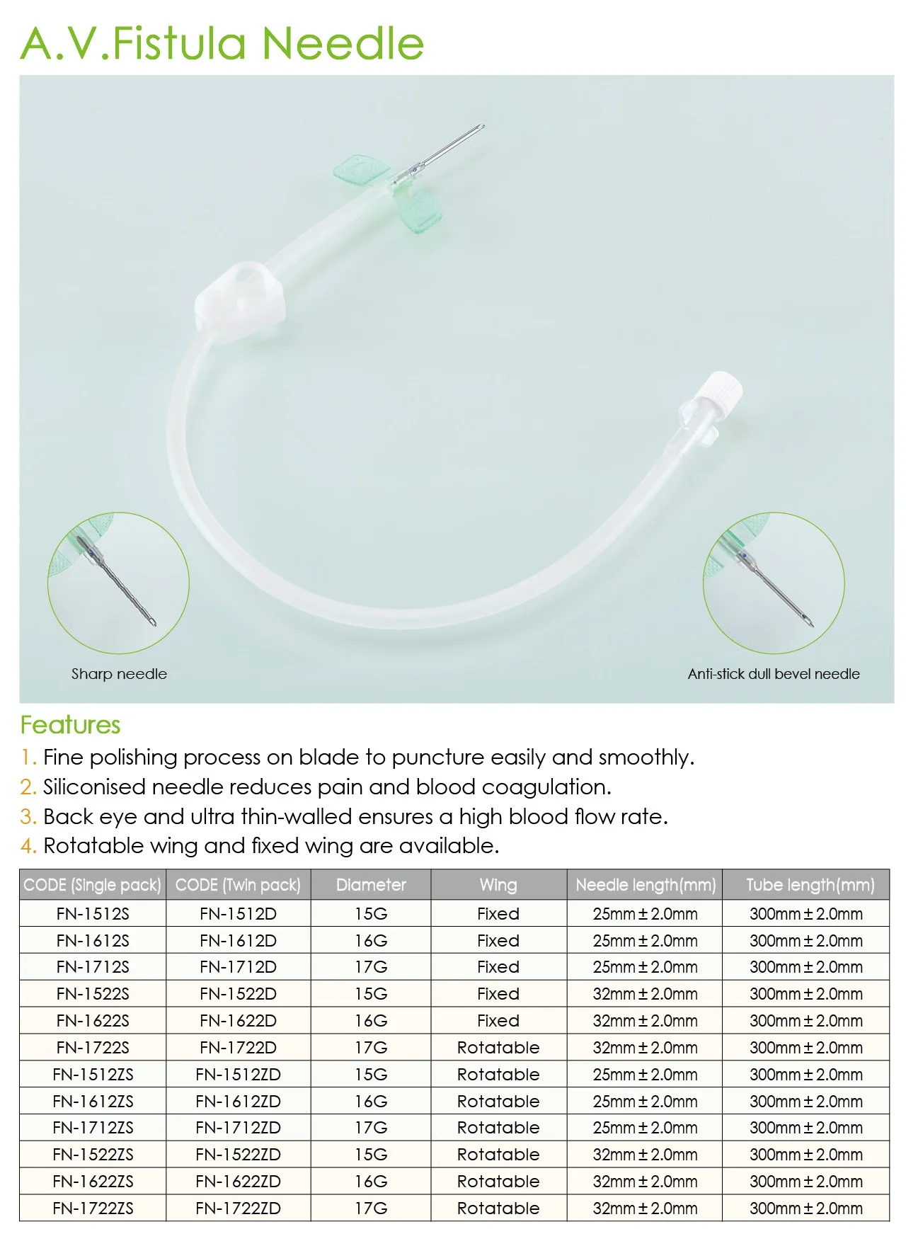 Features 1. Fine polishing process on blade to puncture easily and smoothly. 2. Siliconised needle reduces pain and blood coagulation. 3. Back eye and ultra thin-walled ensures a high blood flow rate. 4. Rotatable wing and fixed wing are available.