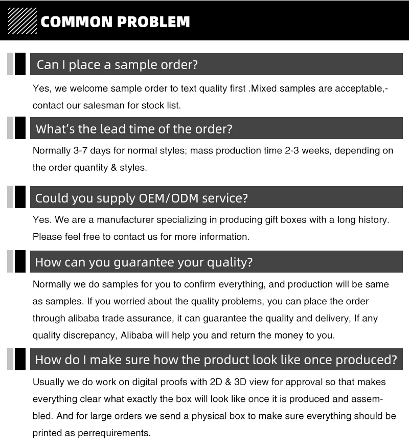 Delivery time | Small order 5-10working days, bulk order 30-40 working days, according to the product and quantity, delivery time will have different. |