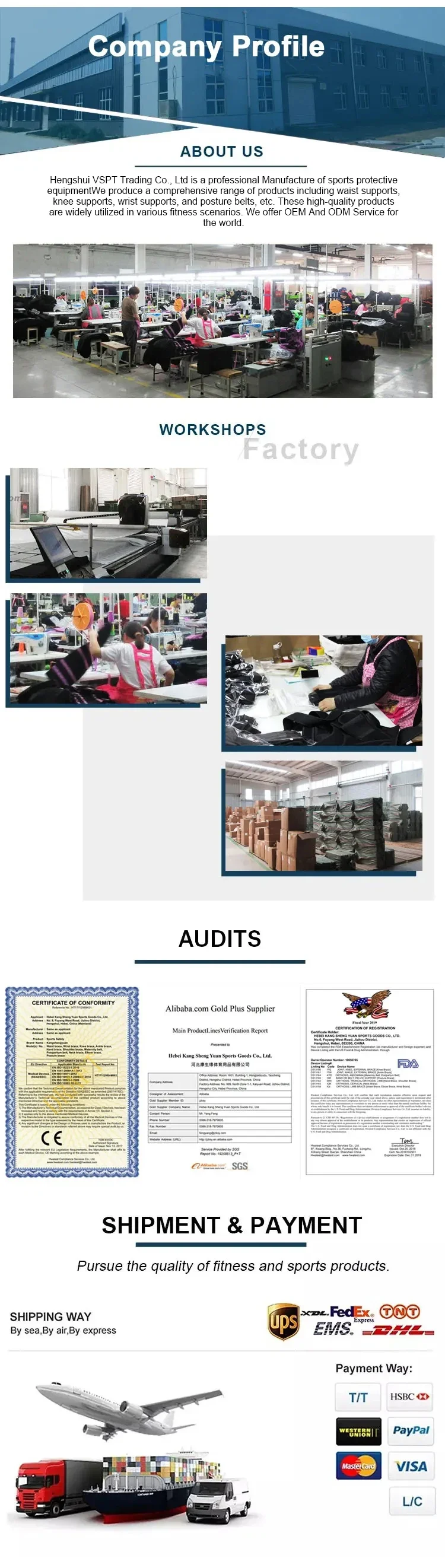 Hengshui VSPT Trading Co., Ltd is a professional Manufacture of sports protective equipment, which is located in Medical Industrial Park, jizhou zone , Hengshui city,Hebei province.We produce a comprehensive range of products including waist supports, knee supports, wrist supports, and posture belts, etc. These high-quality products are widely utilized in various fitness scenarios. We offer OEM And ODM Service for the world.