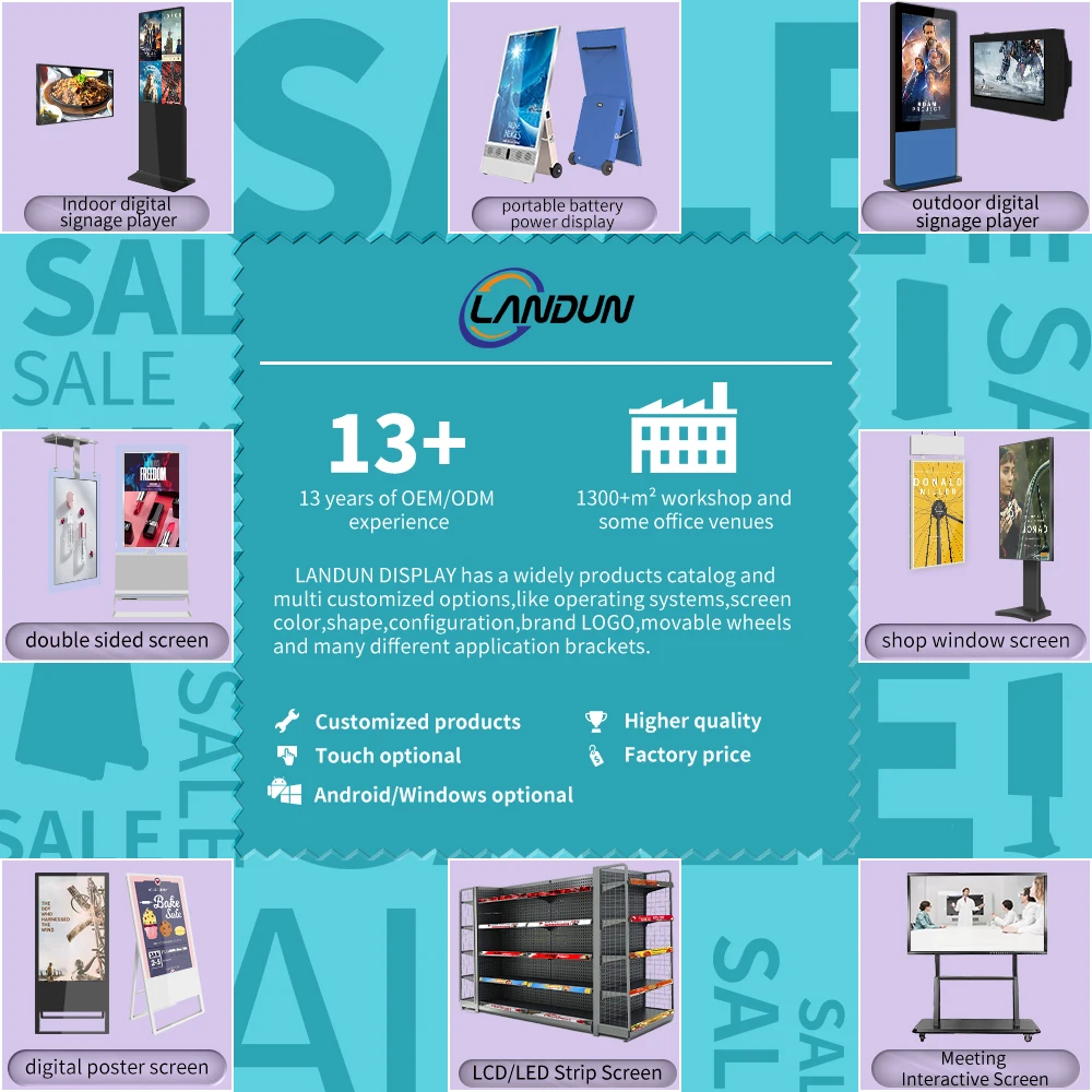 We provide the lcD&l.ED advertising digital signage and display screns, such as LcD indooroutdoor digital signage, shop window display, LCDshelf screen and the battery power display. We have many products can meet your diferent needs,also can provide customize service by your specialneeds.