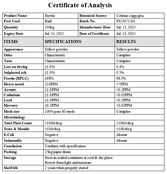 Product Name | Fisetin | Appearance | Yellow powder |