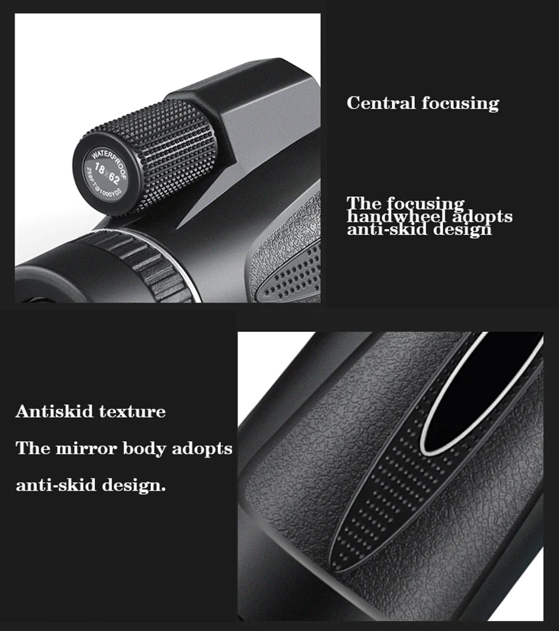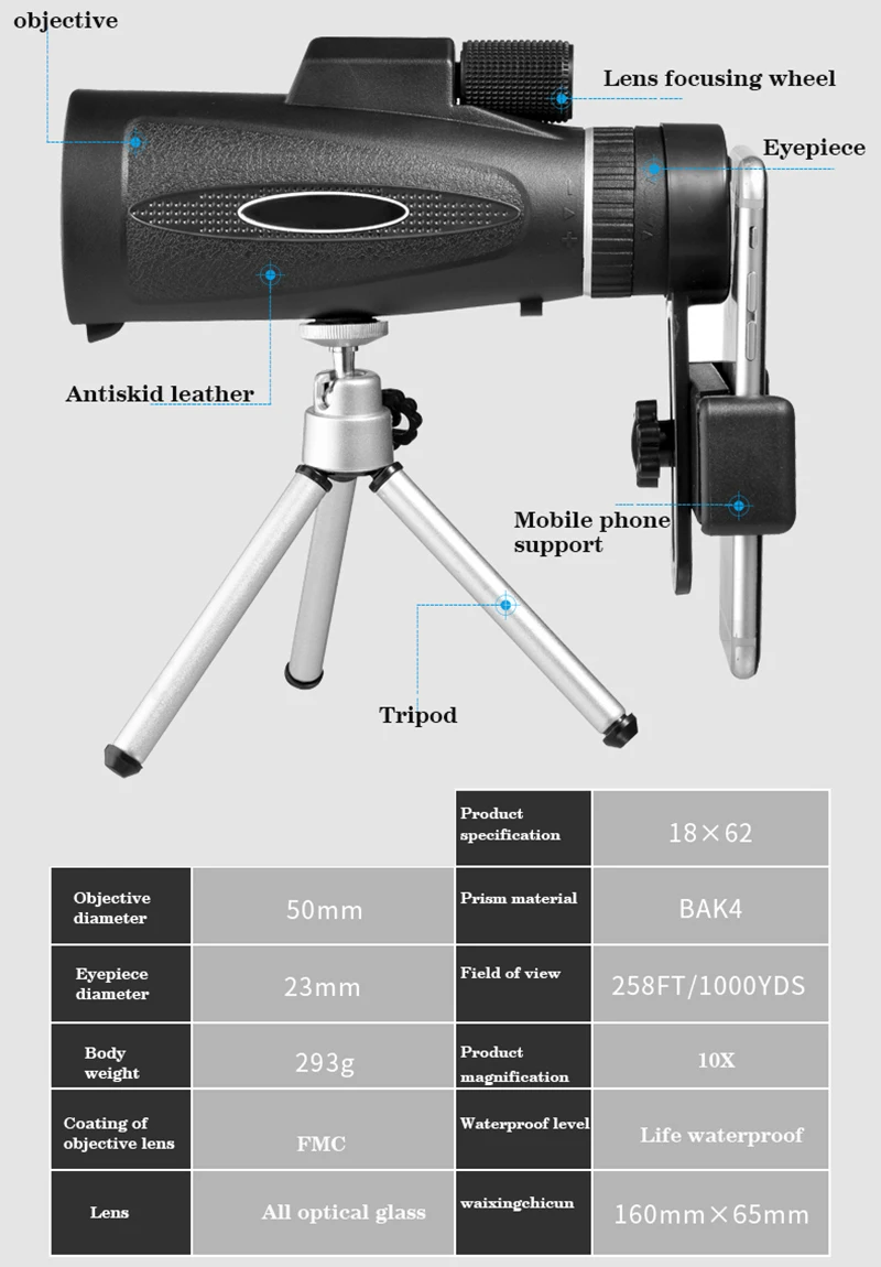 net weight of the monocular 341g,, Accessories:silver retractable tripod, mobile phone adapter, English manual, three-layer corrugated high-quality color box, clean cloth, wrist strap, monocular bag,