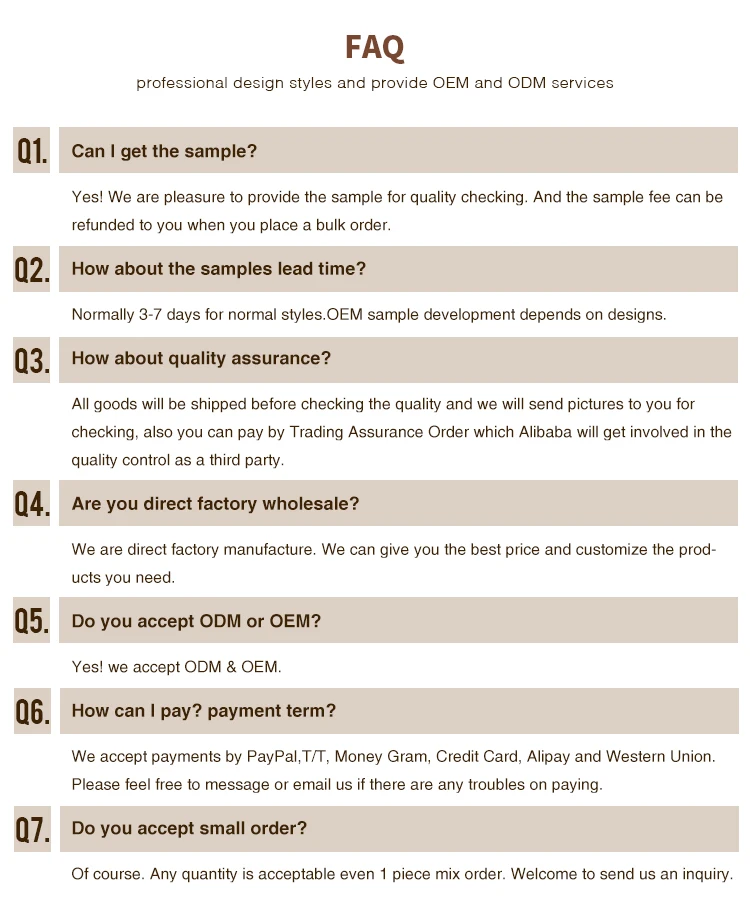 Delivery time | For products in stock, we can ship it within 7 days after receiving your payment. For OEM order production time is 20-35 days after confirmed every details. |